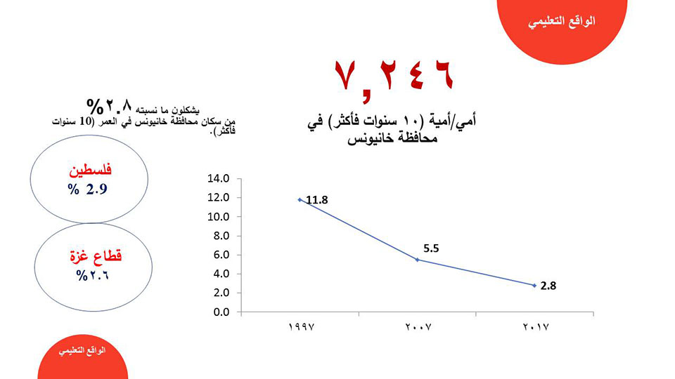 واعتبر مدير مديرية التربية والتعليم بخانيونس عبد الرحيم الفرا أن مشروع التعداد مشروع وطني وسيادي بامتياز، وأنه استحقاق قانوني وإحصائي وتنموي، موضحاً بأن هذه النتائج تفيد المنظومة التعليمية في معرفة بيانات عن الأميين وأماكن تمركزهم وأعمارهم وأحوالهم الاجتماعية والاقتصادية، مما يساعد على دراسة هذه الظاهرة ووضع البرامج المناسبة للقضاء عليها.