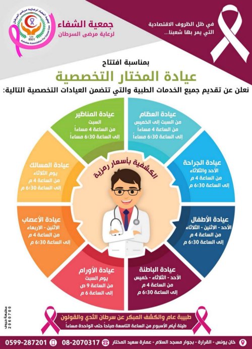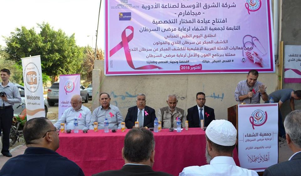 نظمت جمعية الشفاء لرعاية مرضى السرطان اليوم، السبت 20-10-2018م، يومًا طبياً مجانياً تحت رعاية شركة الشرق الأوسط لصناعة الأدوية (ميجا فارم) لأهالي بلدة القرارة تخلله افتتاح عيادات المختار التخصصية كباكورة لمشاريعها الخيرية لأهالي المنطقة.