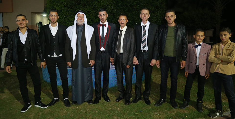 محمد الاسطل (إبن خال العروس)، محمد عدلي فروانة (شقيق العروس)، مهران سفيان( شقيق العريس)، أ . يوسف سفيان الأغا (شقيق العريس)، والد العروس، العريس، والد العريس، مأمون سفيان الاغا (شقيق العريس)، ضياء عدلي فروانة (شقيق العروس)