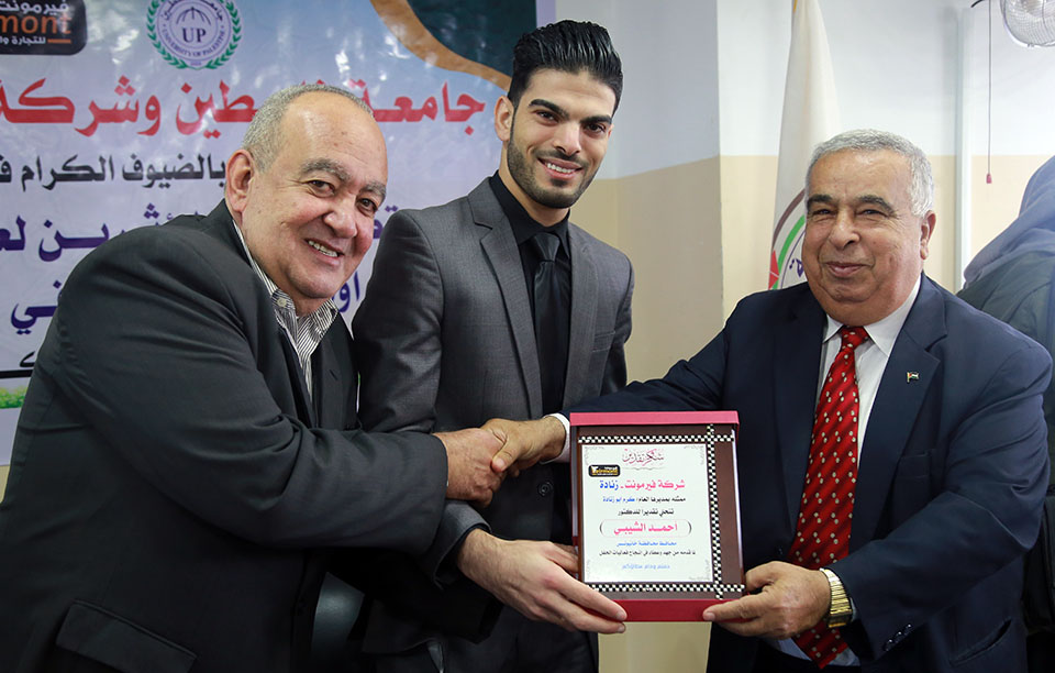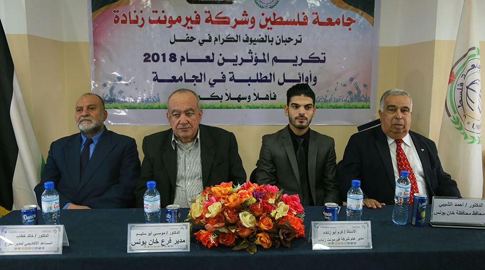 د. أحمد الشيبي (محافظ محافظة خان يونس)، أ. كرم أبو زنادة (مدير عام شركة فيومنت زنادة) د. موسى أبو سليم(مدير جامعة فلسطين فرع الجنوب)، د. خالد خطاب (مساعد أكاديمي)