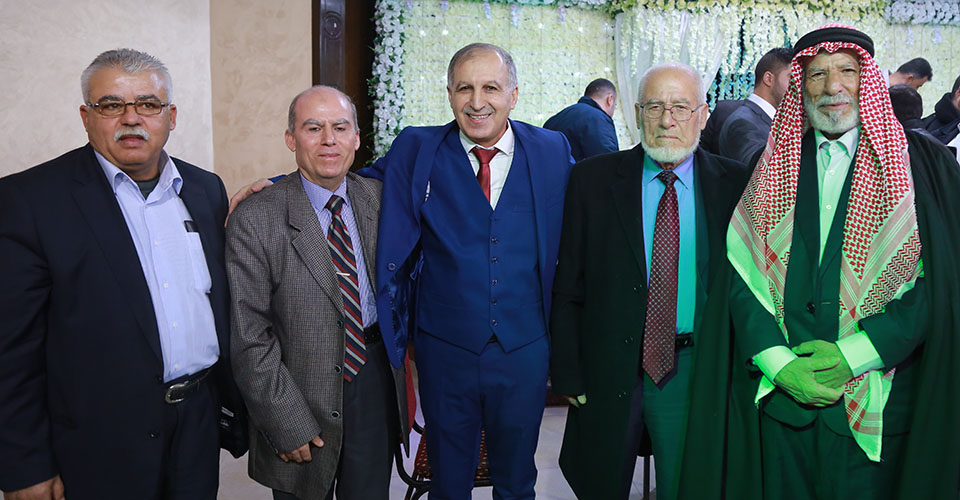 د. عاطف عثمان الأغا( شقيق العروس)، أ. عمر عودة الأغا، د. عايش محمود شومان( والدالعريس)، العريس، م. عودة محمد الأغا