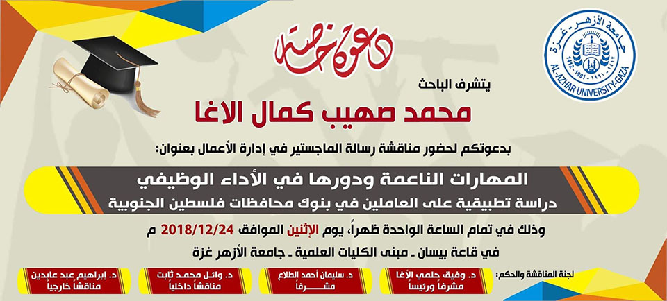 لبيتم فشكرى لن يوفيكم ..وإن سعيتم فإن السعى مشكوراً.. بأسمى معانى الود ..وارفع ايات التقدير .. أتشرف بدعوتكم لحضور مناقشة رسالة الماجستير إبننا الغالي (محمد صهيب كمال الأغا.) وهذة تعتبر بمثابة دعوة خاصة لكم أحبتي