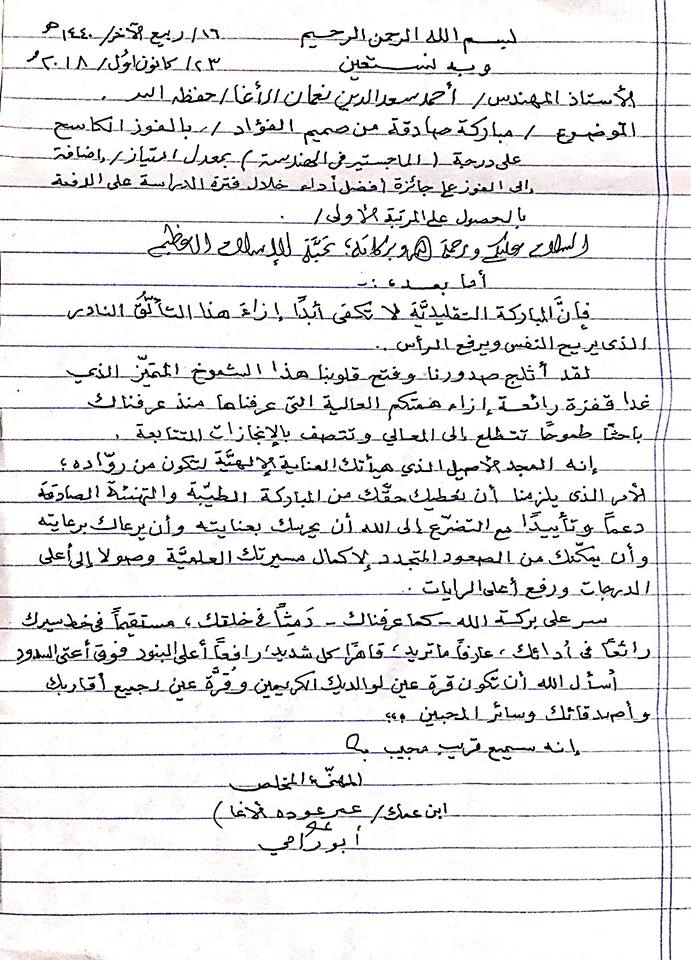 الرئيسة/متفرقات/تهئة من أ. أبو رامي للمهندس أحمد سعدالدين نعمان متفرقات تهئة من أ. أبو رامي للمهندس أحمد سعدالدين نعمان تاريخ النشر : الإثنين | 24-12-2018 | 09:11 2701 اضغط هنا للتواصل أو التعرف على الدكتور أحمد سعدالدين نعمات إسعيد محمد سالم إبراهيم(بدوي) الأغا يمكنك تلقي أحدث الأخبار أول بأول بانضمامك لإحدى مجموعات الواتساب الخاصة بالعائلة من خلال الضغط هنـا اظهر المزيد