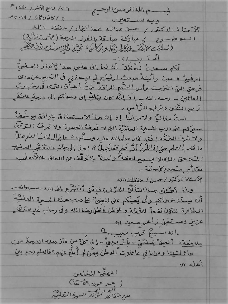 الأخ القدير المربي الكبير/ عمر عودة الأغا (أبو رامي)، إنني وفي هذه اللحظات، أبحث عن كلمات الشكر وعبارات الثناء التي تليق بمقامكم، ولكن لم أجد ما يوفيكم قدركم، فقد غمرتموني بكرم وطيب اخلاقكم، ومشاعركم الفياضة والنبيلة، وانني أقف احترما وتقديرا لكم، لتهنئتي ومشاركتي الفرحة بالترقية، والتي كان لها عظيم الأثر على نفسي، وأقول لكم شكراً من كل أعماق قلبي، وجعلكم ذخراً للوطن ولمجبيك. ا.د. حسن عبد الله النجار