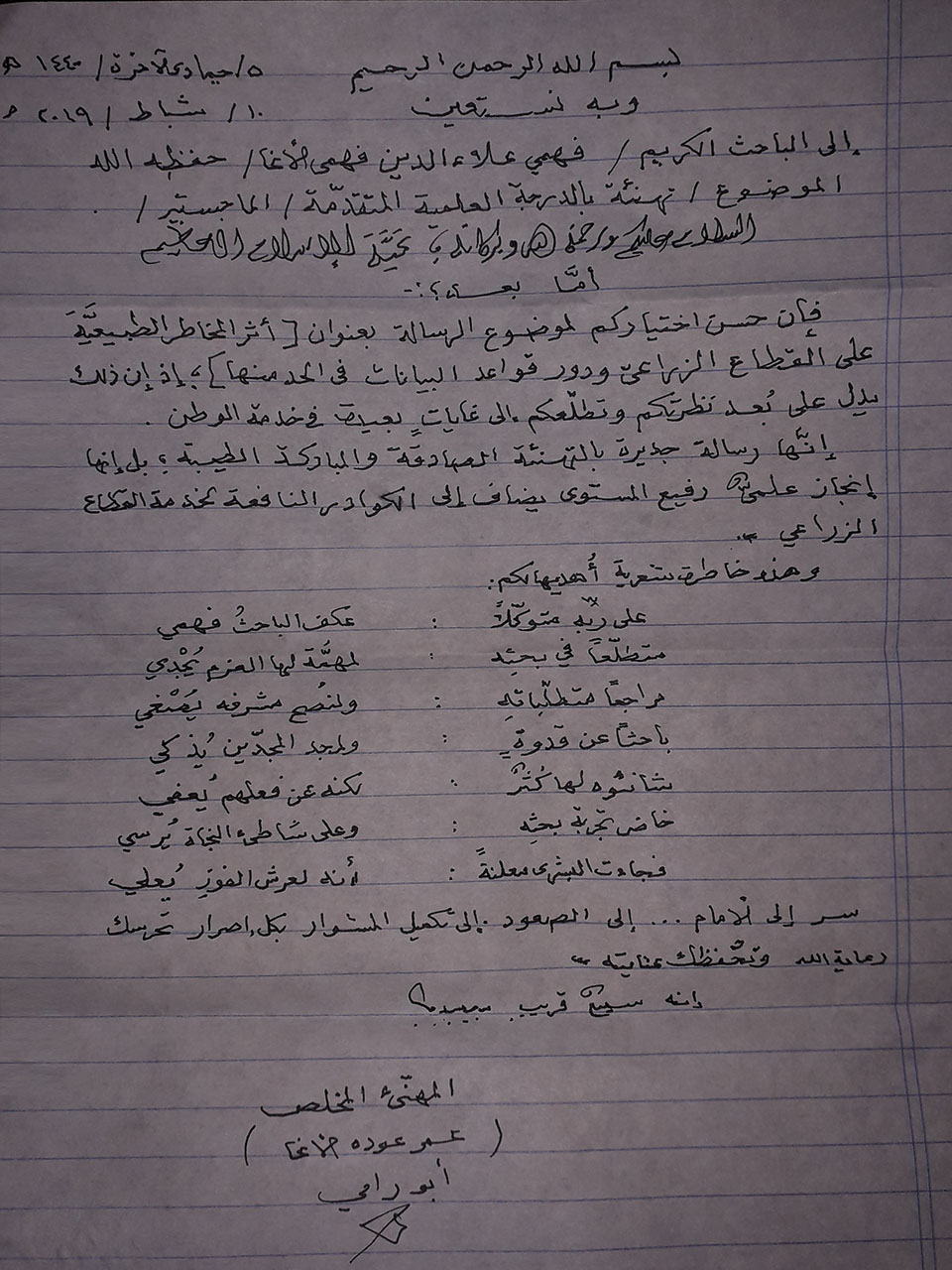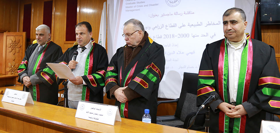 الجامعة الإسلامية غزة الأحد 10-02-2019 حصل الباحث فهمي علاء الدين فهمي الأغا على درجة الماجستير في إدارة الأزمات والكوارث بعنوان أثر المخاطر الطبيعية على القطاع الزراعي ودور قواعد البيانات في الحد منها (2000-2018) قطاع غزة فلسطين، وتكونت لجنة المناقشة من د. حسام محمد محمود النجار مناقشاً داخلياً، أ. د. محمد رمضان الأغا مشرفاً ورئيساً، د. نبيل عبدالرحمن أبوشمالة مشرفاً، د. أحمد حسين أحمد المشهرواي مناقشاً خارجياً. والف مبــــــــــــــــــــــــــــــــــــــــــــــــــــــــــــــــــــــــــارك.