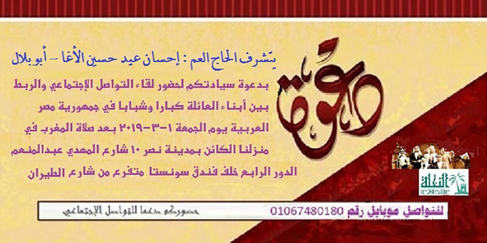 الرئيسة/متفرقات/مصر- دعوة لحضور لقاء التواصل الإجتماعي متفرقات مصر- دعوة لحضور لقاء التواصل الإجتماعي تاريخ النشر : الجمعة | 22-02-2019 | 23:07 3258 اضغط هنا للتعرف على المرحوم الحاج إحسان عيد حسين الأغا يمكنك تلقي أحدث الأخبار أول بأول بانضمامك لإحدى مجموعات الواتساب الخاصة بالعائلة من خلال الضغط هنـا اظهر المزيد