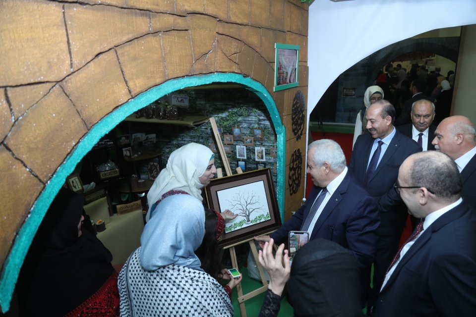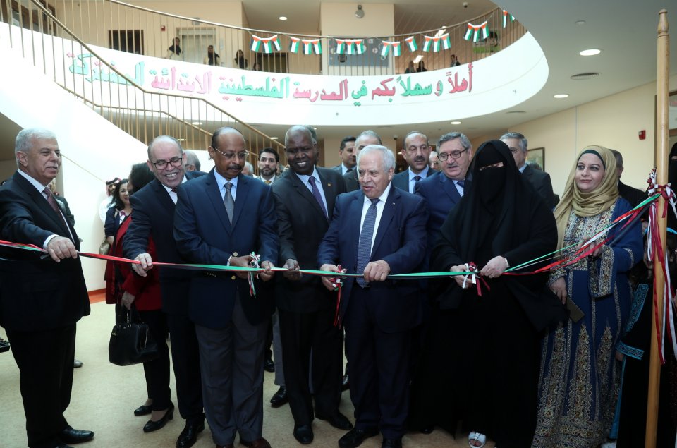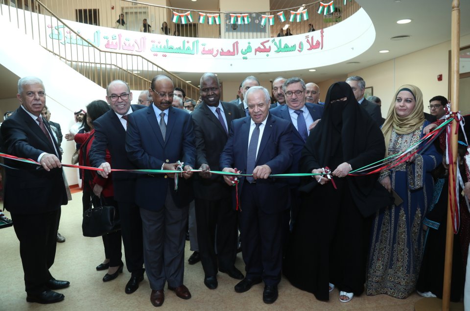 حيث تفضلت الدكتورة حمدة السليطي الأمين العام للجنة الوطنية القطرية للتربية والثقافة والعلوم، والأستاذة / سناء القحطاني وعميد السلك الدبلوماسي، والسفير منير غنام، والدكتور / يحيى الأغا والسفراء وطاقم المدرسة من إداريين ومعلمين بقص شريط الفعالية بعد أداء النشيدين الوطنيين القطري والفلسطيني.