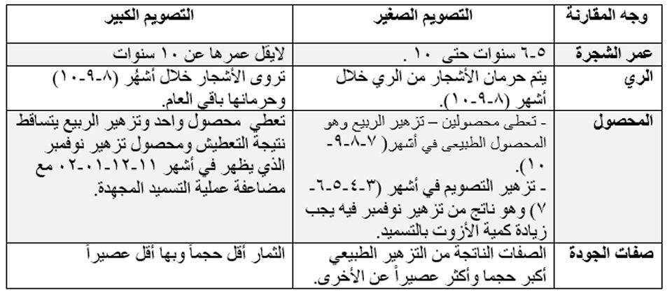 أما في حالة الصيام الكبير يكون للأشجار التي تجاوز عمرها 10 سنوات تُصوَّم 9 أشهُر في السنة وتُروى من 3-4 ريات خلال أشهُر سبتمبر وأكتوبر ونوفمبر فيكون تزهيرها خلال تلك الفترة وتنموثمارُها الأكثرعدداً والأغلى ثمناً خلال الفترة من شهر مارس حتى يونيو. وبالرغم من عملية التصويم القاسية خلال الفترة من سبتمبر حتي نوفمبر، فإن الأشجار تُزهِر نسبة أقل من الأزهار خلال شهري مارس وإبريل بصورةٍ رئيسية لِما هو جاري في فصل الربيع وتكون ثمارُها من نوفمبر حتي فبراير من العام التالي بمحصولِها الثانوي الأقل نسبيا من ناحية الثمار وصفاتِها، ويؤدي التَّصويم الكبير إلي العبث فسيولوجِياً بالأشجار مما يُؤدِّي إلى تدَهُورها وقِصَرعُمرِها.