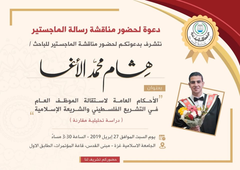دعوة لحضور مناقشة رسالة ماجستير في الشريعة والقانون للباحث أ. هشام محمد مصطفى الأغا وذلك يوم السبت 27-04-2019 الساعة الثالثة والنصف ظهرا بمبنى القدس قاعة المؤتمرات الطابق الأول في الجامعة الإسلامية بغزة.