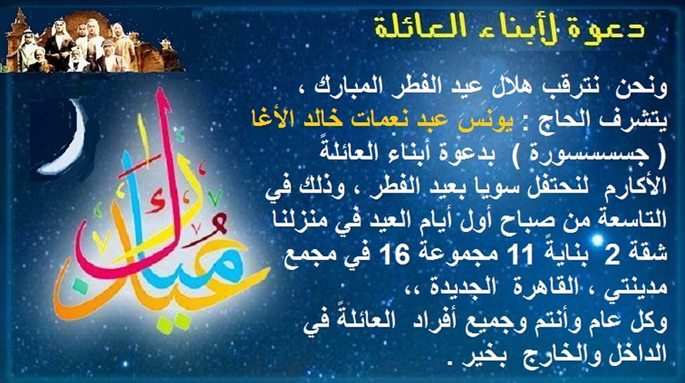 الرئيسة/أعياد/القاهرة- دعوة لحضور جلسة عيد الفطر 2019 أعياد القاهرة- دعوة لحضور جلسة عيد الفطر 2019 تاريخ النشر : الخميس | 30-05-2019 | 14:52 4070 اضغط هنا للتعرف على المرحوم أ. يونس عبد نعمات خالد الأغا يمكنك تلقي أحدث الأخبار أول بأول بانضمامك لإحدى مجموعات الواتساب الخاصة بالعائلة من خلال الضغط هنـا اظهر المزيد