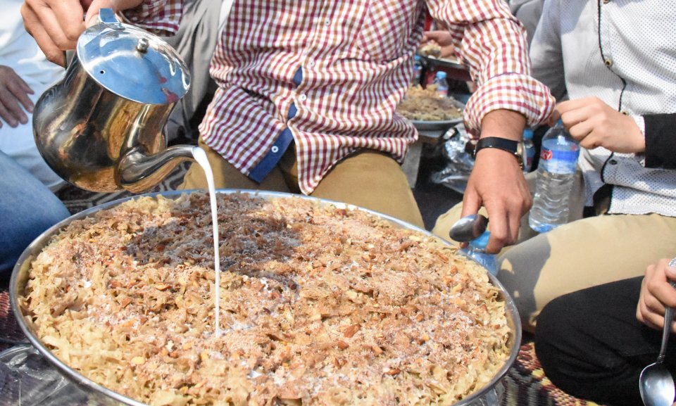 ويتم تزيينها بالجوز، واللوز، والكاجو، والمكسرات الأخري، والسمن البلدي والحليب وغيرها، وقد أستحدثت فى الآونة الأخيرة بعض المقبلات معها مثل الحمص ، وبابا غنوج، ومتبلات، وسلطات، والفسيخ وغيره، مما أضفى عليها نوعاً من التراث الفلسطيني الأصيل، ويليها تقديم الفواكه المحلية، وشرب القهوة العربية، سائلين الله أن يجزي الجميع خير الجزاء.