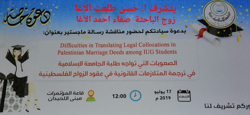 يتشرف أ. حسن طلعت الأغا زوج الباحثة بدعوة سيادتكم لحضور مناقشة رسالة الماجستير بعنوان