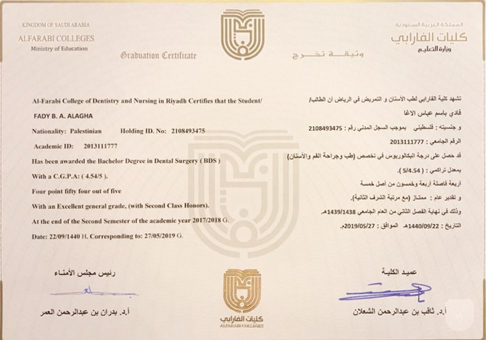 السعودية - تخرج الدكتور فادي باسم عباس جاسر الأغا في كلية الفرابي لطب الأسنان والتمريض بتقدير عام ممتاز مع مرتبة الشرف، وألف مبارك التميز