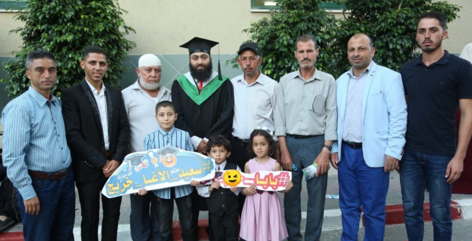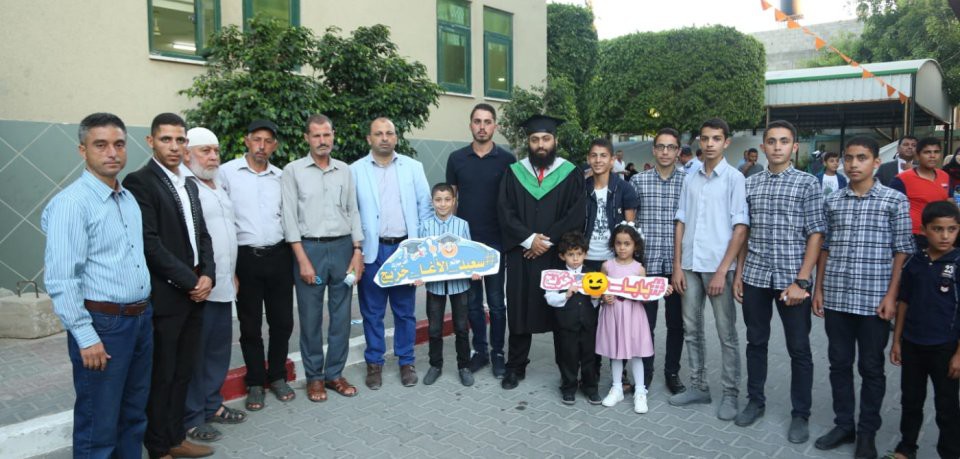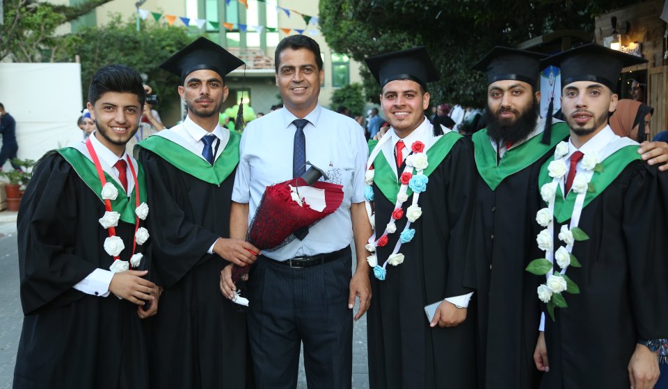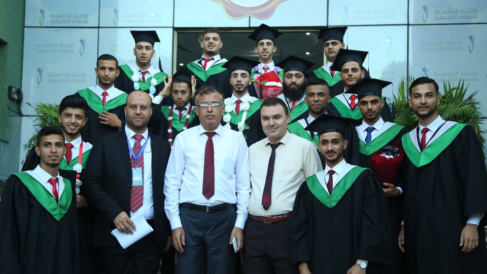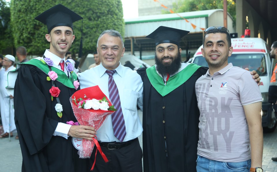الدكتور وليد الصالحي( مدير التخديروالانعاش في مستشفي غزة الأوروبي ) يتوسط الخرجين