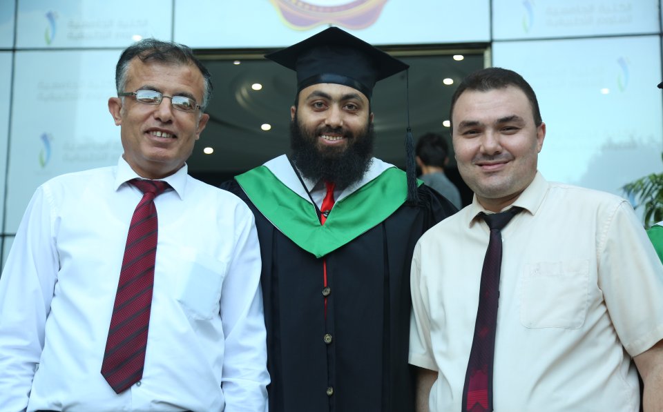 الخريج يتوسط د. سامر النواجحة(المشرف المباشر لتخصص التخدير والانعاش)، د.علي الخطيب( عميد المهن الصحية )