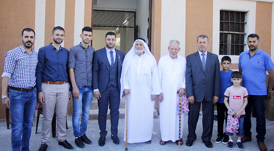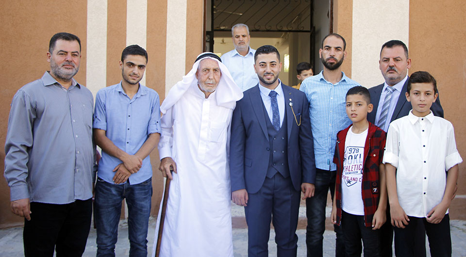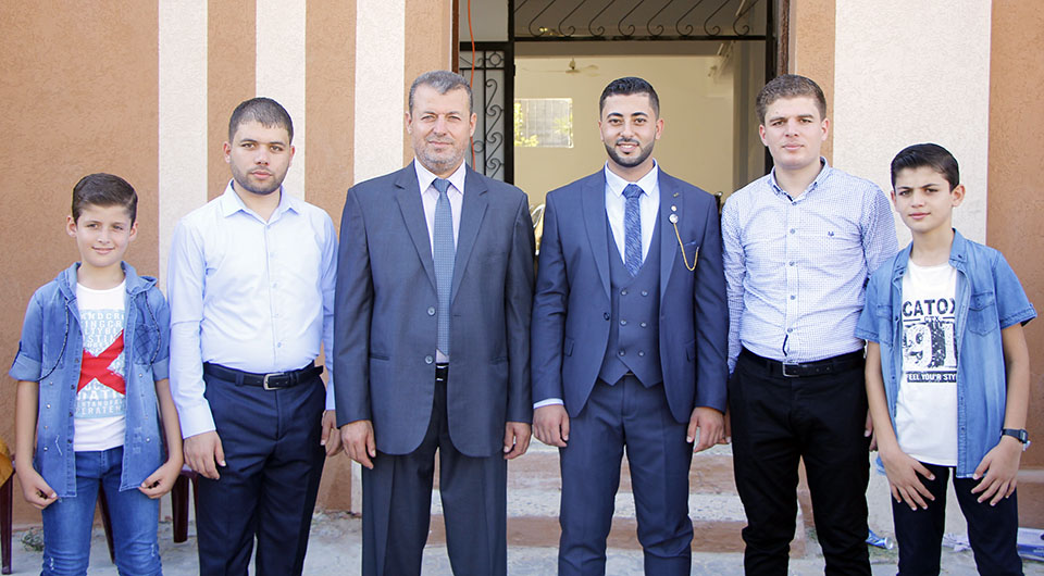 أ. أحمد إحسان(إبن خالة العريس)، أ. أمير(شقيق العريس)، أ. معاذ العبادلة، العريس، الحاج صلاح سليمان، أ. محمد صلاح(عديل العريس)ونجله صلاح، والد العروس ونجله عبد الله