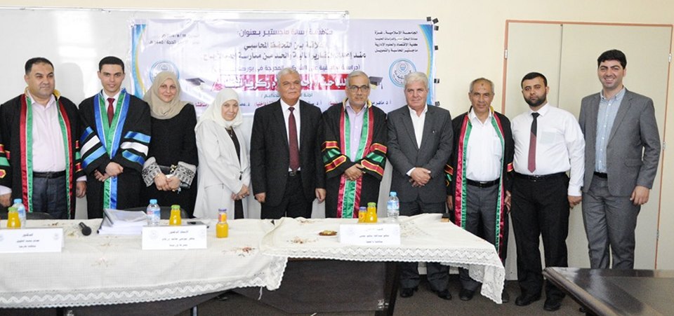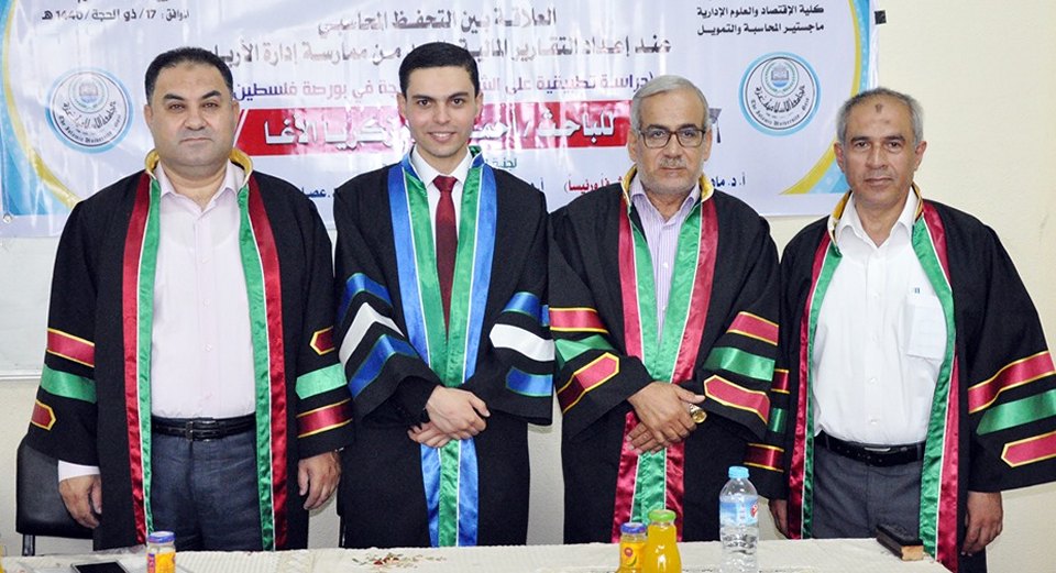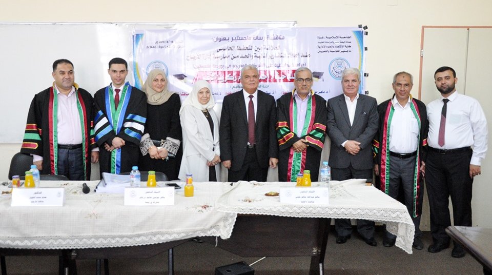 كلية الاقتصاد والعلوم الادارية- الجامعة الاسلامية بغزة الاحد الموافق 18-08-2019 تم بحمد الله وتوفيقه مناقشة رسالة الماجستير للباحث أ. أحمد سلام الأغا بعنوان التحفظ المحاسبي عند اعداد التقارير المالية والحد من ممارسة ادارة الارباح- دراسة على الشركات المدرجة في بورصة فلسطين، والف مبارك.