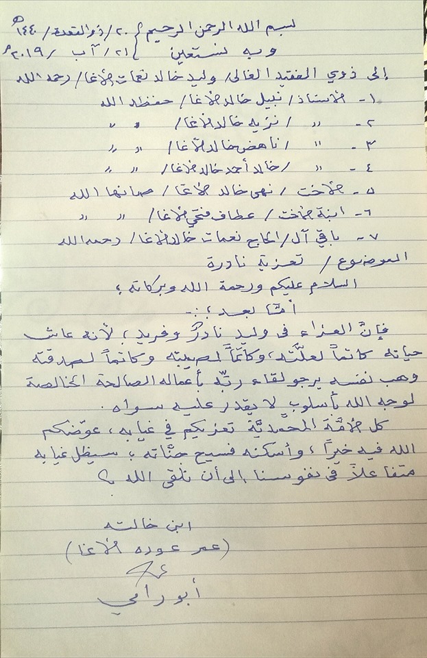 - العزاء في قطر في منزل شقيقه أ. أبوخلدون نبيل الكائن بمنطقة عين خالد في الدوحة لمدة ثلاثة ايام بعد صلاة المغرب للرجال فقط ابتداء من اليوم الاربعاء رقم الهاتف 0097466875862