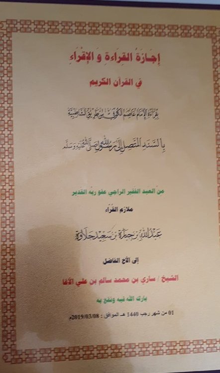 حصول أ.ساري محمد سالم الأغا، على إجازة القراءة والاقراء في القرآن الكريم بقراءة الإمام عاصم الكوفي بالسند المتصل إلى رسول الله (صلى الله عليه وسلم) من طريق الشاطبية