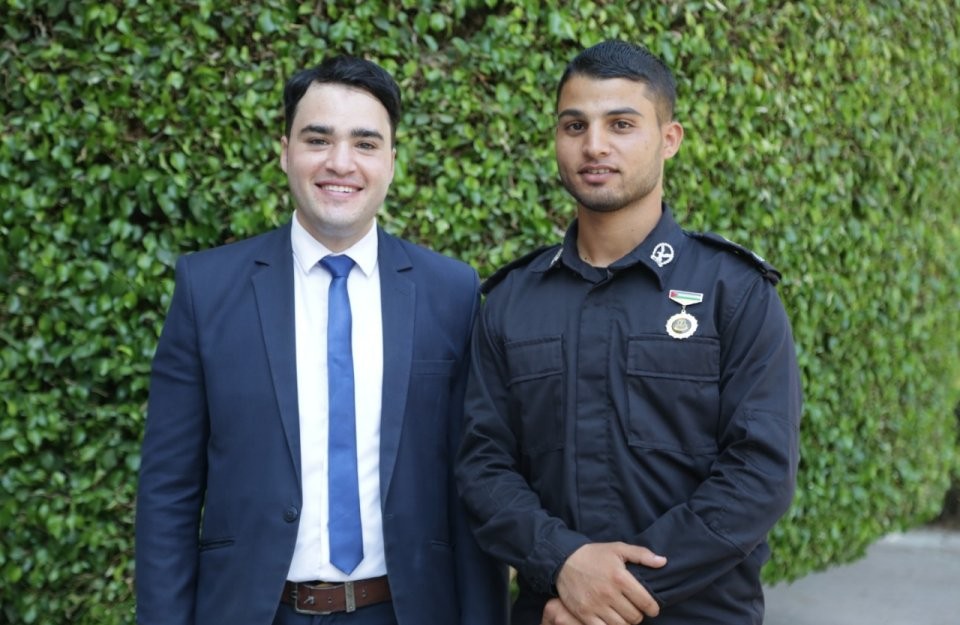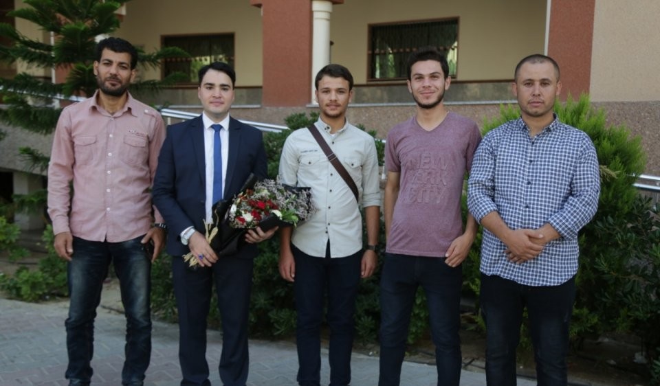 والد الباحث، أ. أبو يوسف الحلاق، أ. عمر عودة، أ. محمد أحمد، أ. محمد الهبيل، الخريج، أ. ابراهيم الهبيل، أ. محمد مزيد، أ. محمد معيد