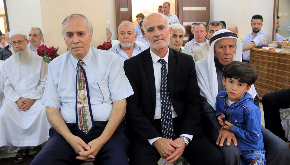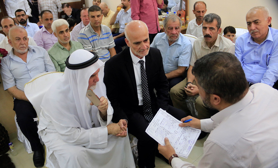 صورة للعريس ووالده رجل الاعمال أ.صلاح عطية الاغا، خلال حفل عقد القران بالامارات