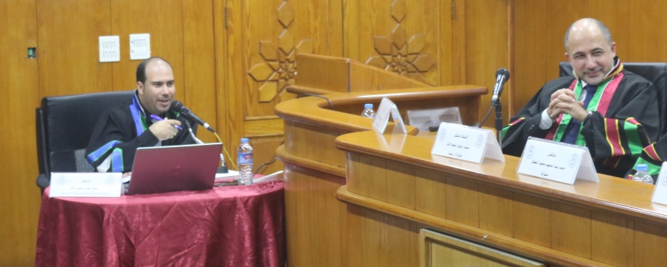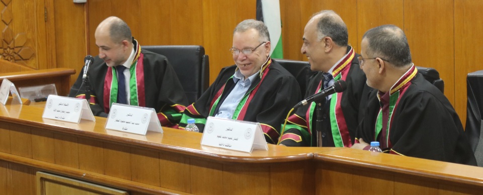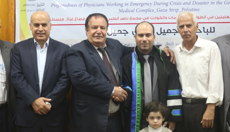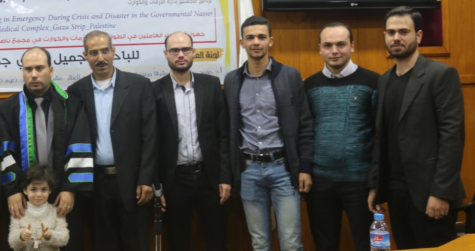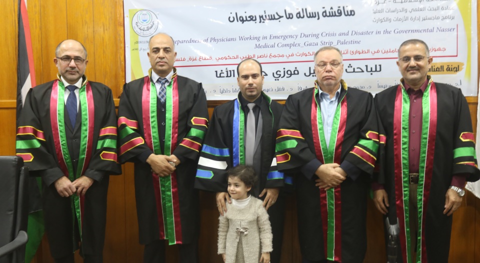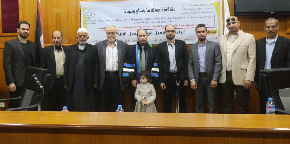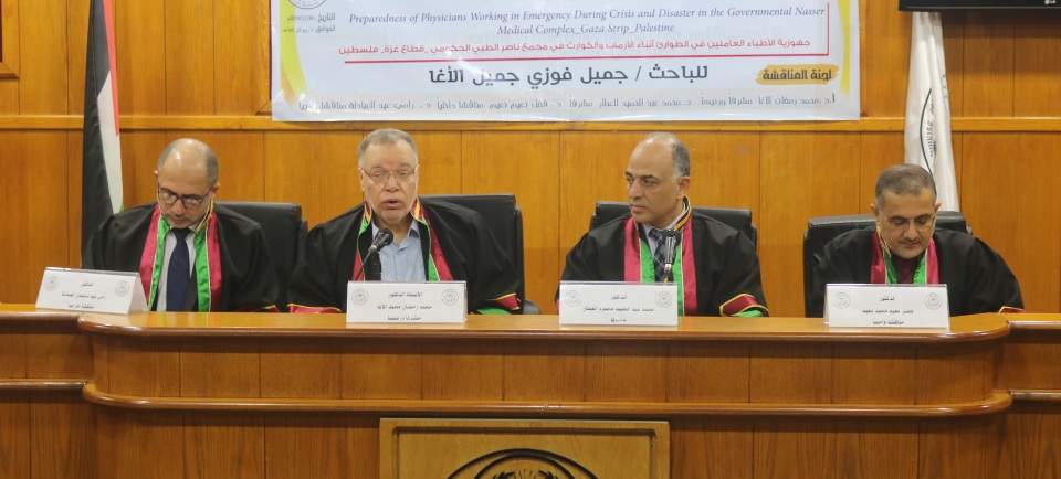 قاعة طيبة الجامعة الاسلامية غزة الموافق السبت 30-11-2019 تم بحمد الله وتوفيقه مناقشة رسالة الماجستير للباحث د.جميل فوزي جميل الأغا وكانت بعنوان جهوزية الأطباء العاملين في الطوارئ أثناء الأزمات والكوارث بمجمع ناصر الطبي الحكومي قطاع غزة فلسطين، وتكونت لجنة المناقشة من أ. د. محمد رمضان الاغا مشرفا ورئيسا، د. محمد عبد الحميد العطار مشرفا، د . فضل نعيم نعيم مناقشا داخليا، د. رامي عيد العبادلة مناقشا خارجيا، الف الف مبارك.