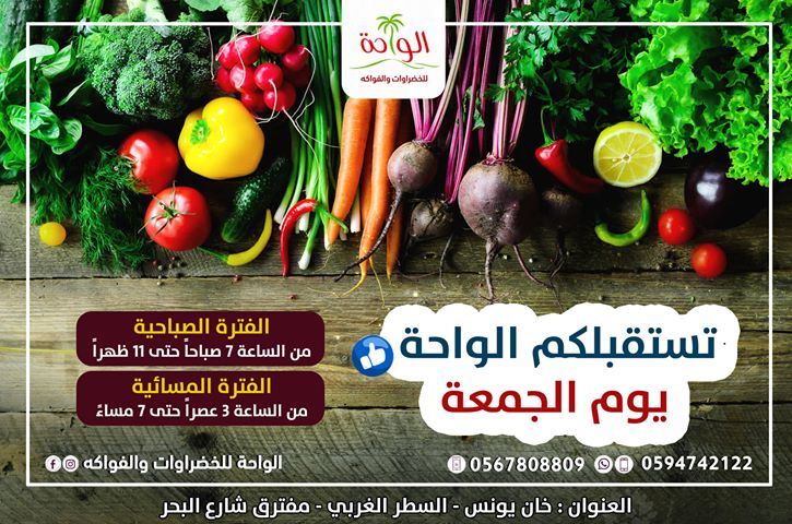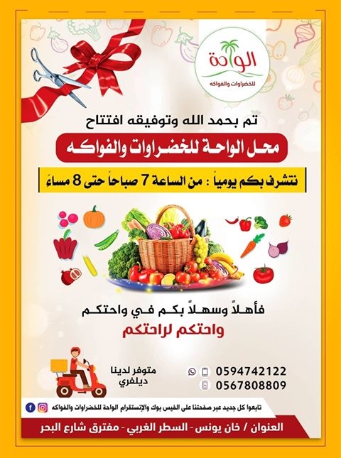 الرئيسة/إعلانات /الواحة للخضروات والفواكه إعلانات الواحة للخضروات والفواكه تاريخ النشر : الثلاثاء | 24-12-2019 | 12:48 4852 الواحة للخضروات والفواكه السطر الغربي خان يونس يمكنك تلقي أحدث الأخبار أول بأول بانضمامك لإحدى مجموعات الواتساب الخاصة بالعائلة من خلال الضغط هنـا اظهر المزيد
