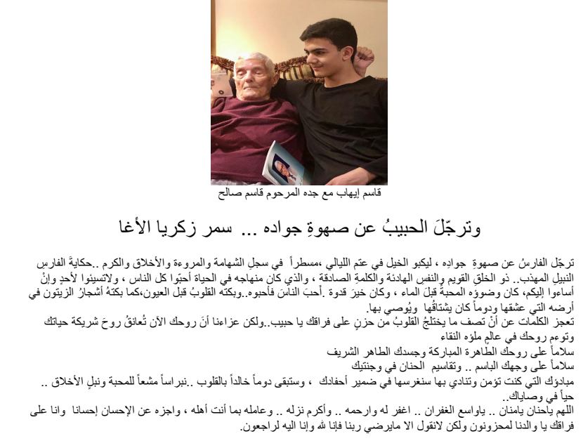 الرئيسة/في ذمة الله/وترجل الحبيب عن صهوة جواده.. سمر زكريا الأغا في ذمة الله وترجل الحبيب عن صهوة جواده.. سمر زكريا الأغا تاريخ النشر : الأحد | 05-01-2020 | 09:57 5822 اضغط هنا للتعرف على المرحوم المهندس الزراعي قاسم صالح علي عثمان الأغا يمكنك تلقي أحدث الأخبار أول بأول بانضمامك لإحدى مجموعات الواتساب الخاصة بالعائلة من خلال الضغط هنـا اظهر المزيد