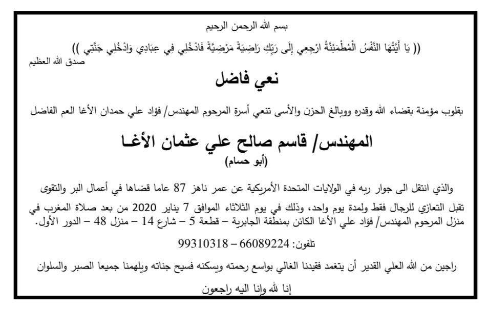 الرئيسة/في ذمة الله/الكويت- صور بيت عزاء الفقيد م. قاسم صالح الاغا في ذمة الله الكويت- صور بيت عزاء الفقيد م. قاسم صالح الاغا تاريخ النشر : الثلاثاء | 07-01-2020 | 22:22 4591 الكويت- صور بيت عزاء الفقيد م. قاسم صالح الاغا اضغط هنا للتعرف على المرحوم المهندس الزراعي قاسم صالح علي عثمان الأغا يمكنك تلقي أحدث الأخبار أول بأول بانضمامك لإحدى مجموعات الواتساب الخاصة بالعائلة من خلال الضغط هنـا اظهر المزيد