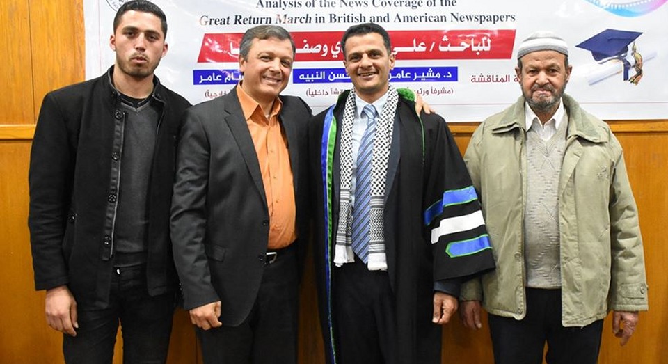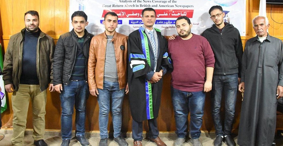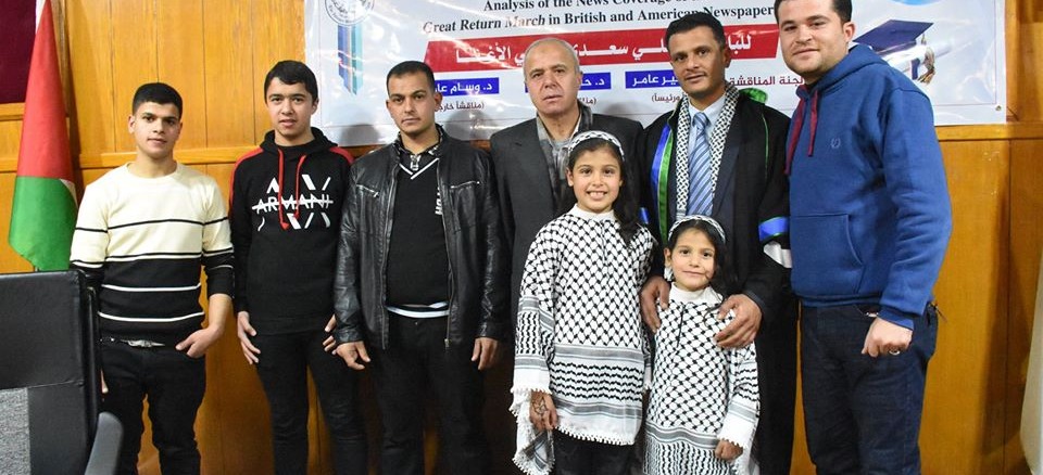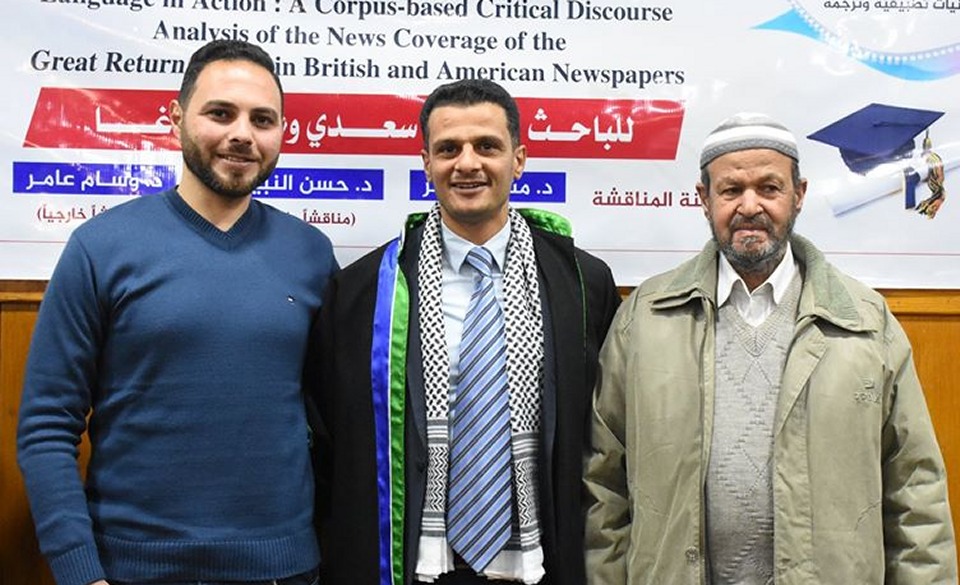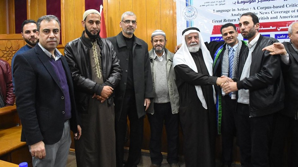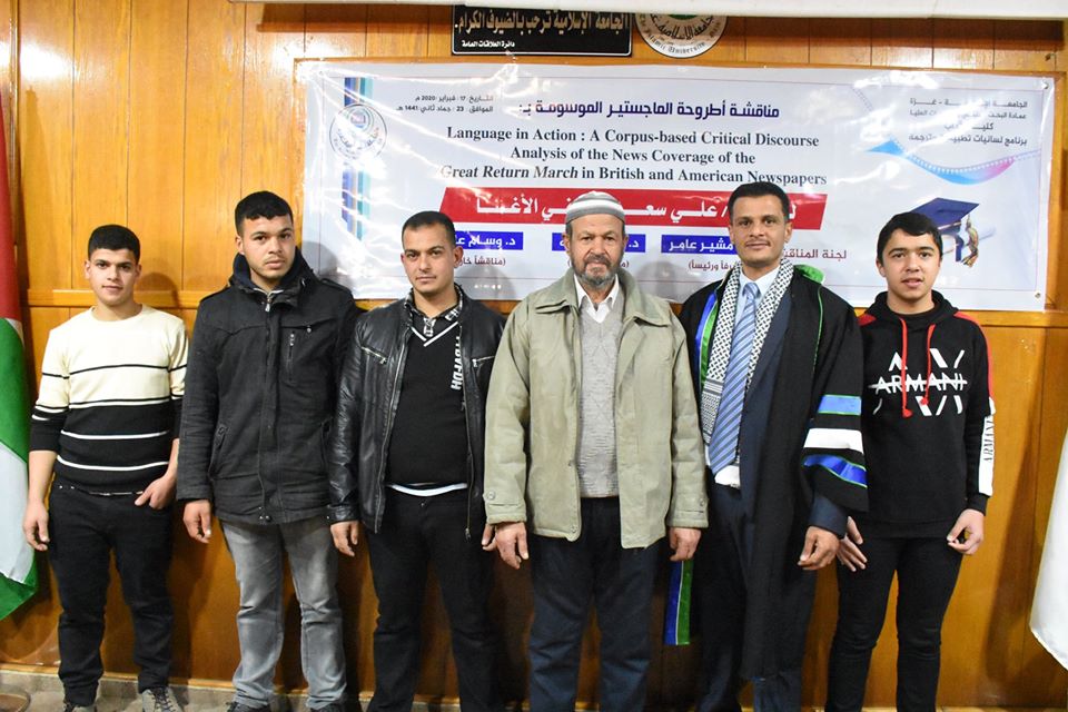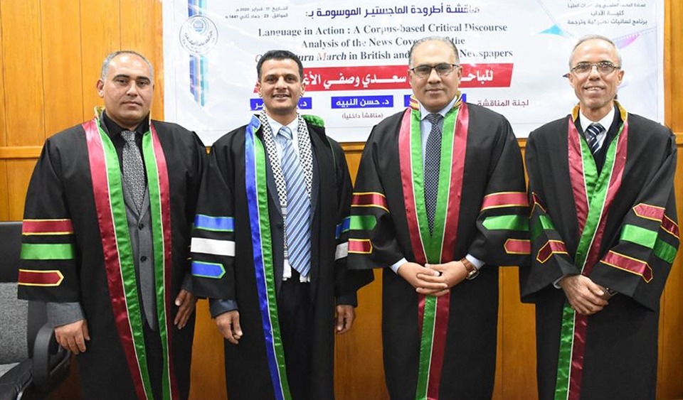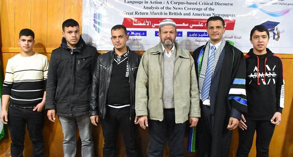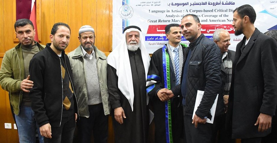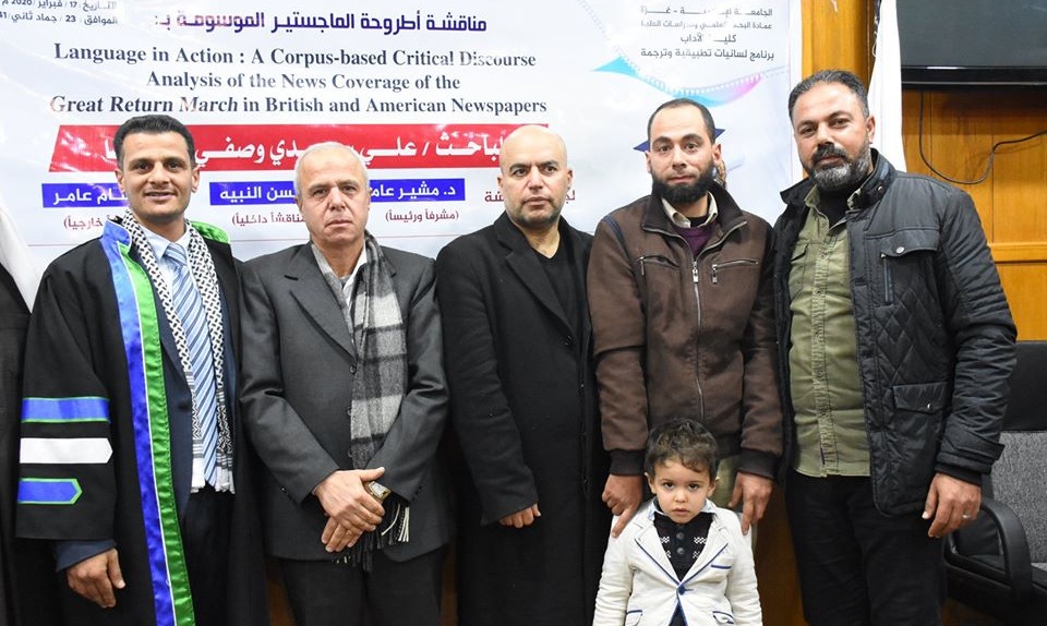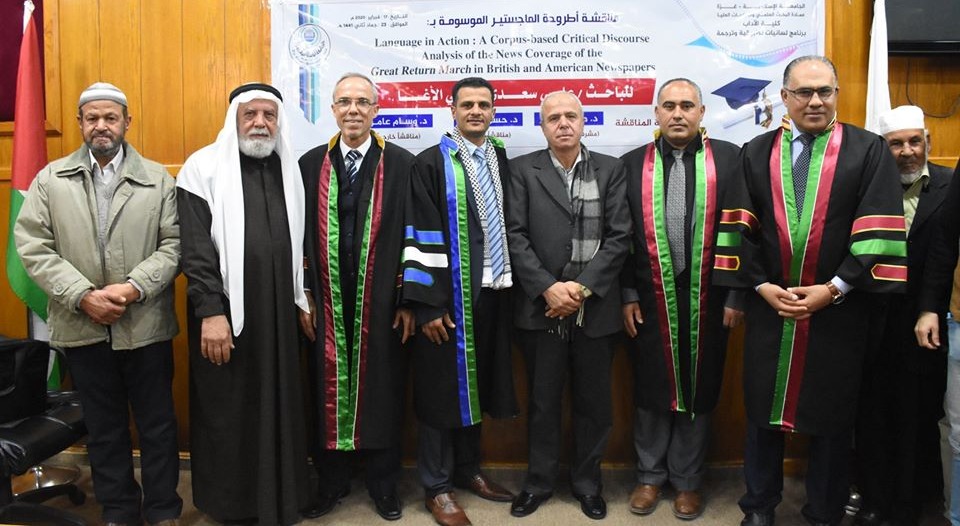 الجامعة الاسلامية -غزة عمادة البحث العلمي والدراسات العليا، ناقش الباحث علي سعدي وصفي غانم الاغا رسالة ماجستير- كلية الاداب بعنوان Language in Action: A Corpus- based Critical Discourse Analysis of the News Coverage of the Great Return March in British and American Newspapers.والف مبارك.