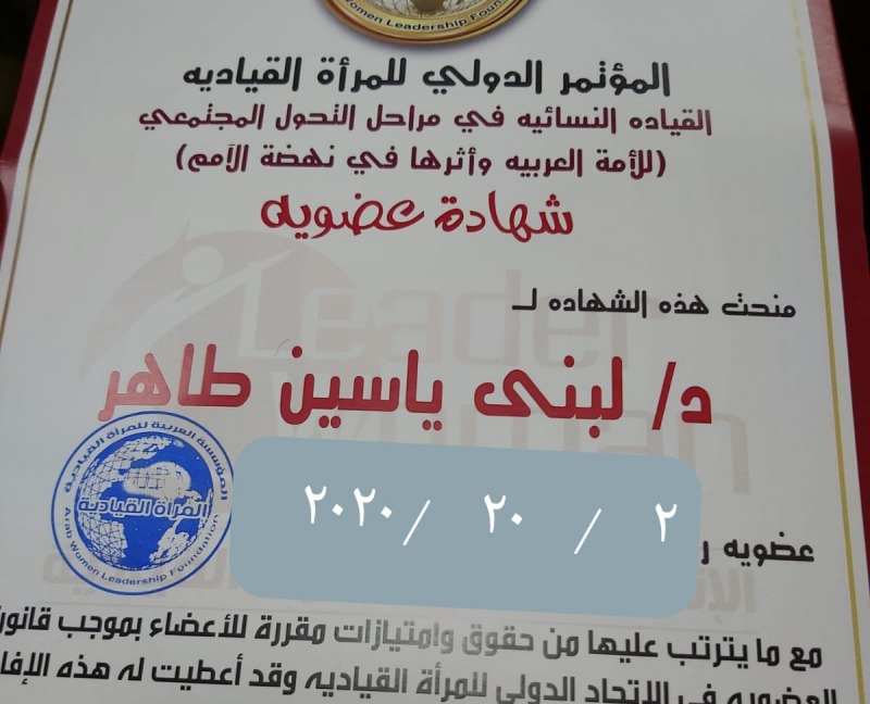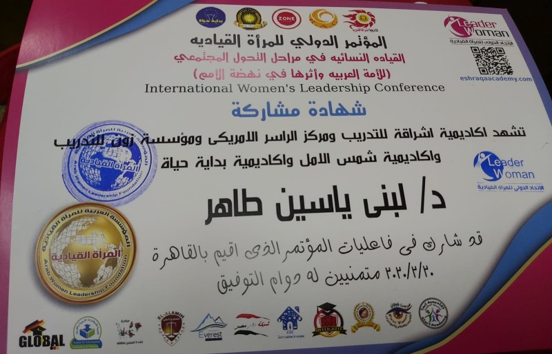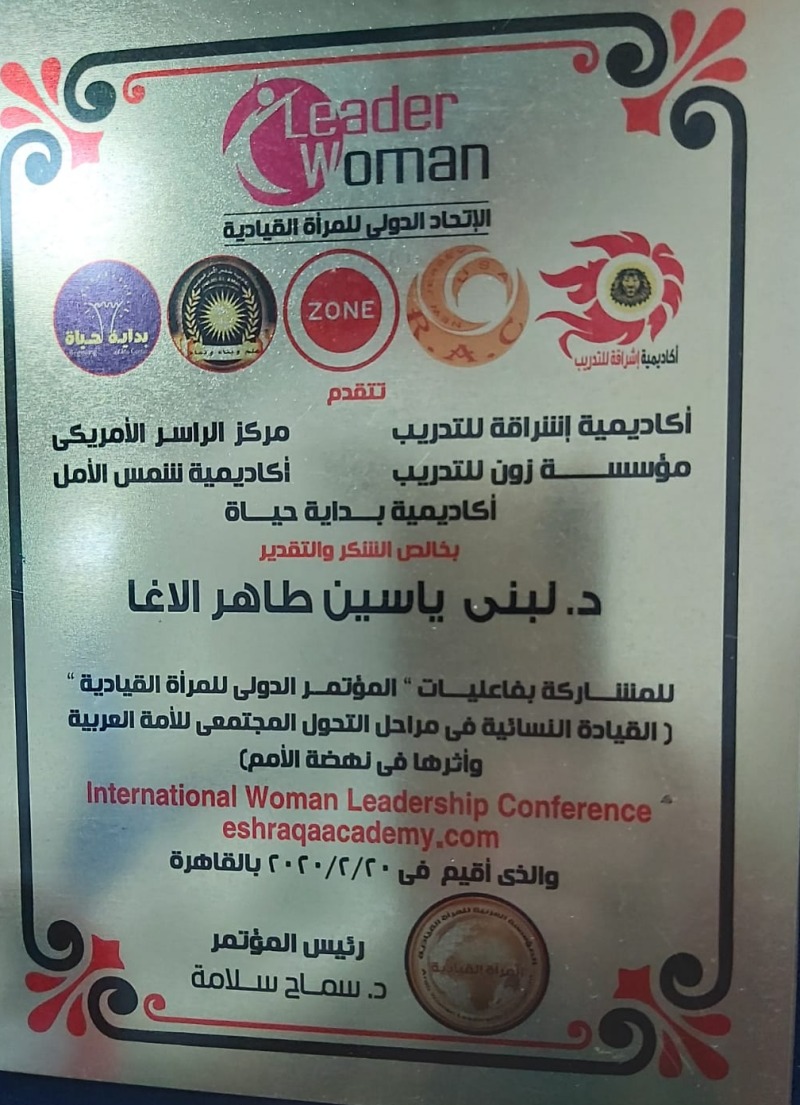 تهنئة للدكتورة لبنى بنت ياسين الأغا لحصولها على عضوية في المؤسسة العربية للمرأة القيادية وذلك إثر مشاركتها بورقة عمل في المؤتمر الدولي للمرأة القيادية النسائية في مراحل التحول المجتمعي للأمة العربية وأثرها في نهضة الأمم التابع لأكاديمية اشراقة للتدريب ومركز الراسر الامريكي ومؤسسة زون للتدريب وأكاديمية شمس الأمل واكاديمية بداية حياة .