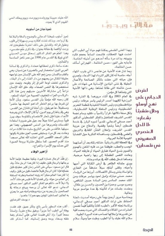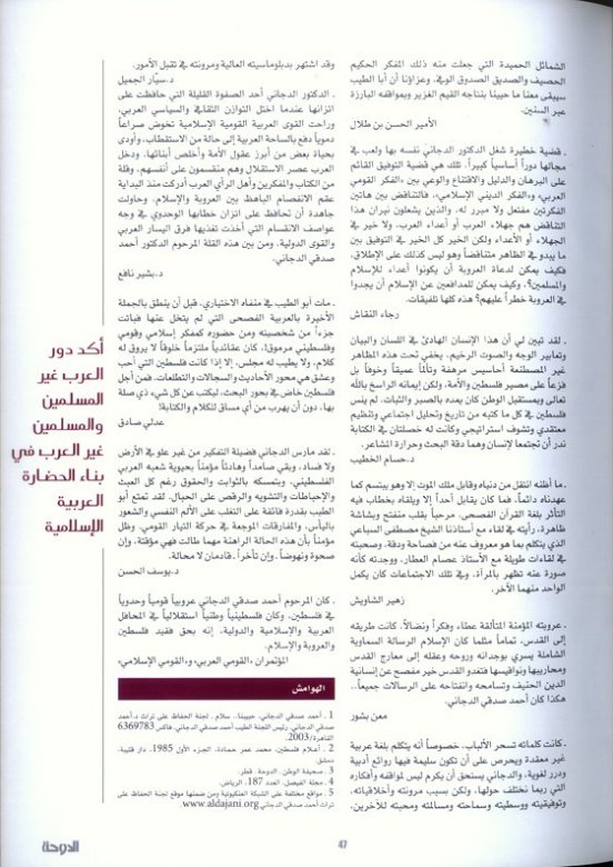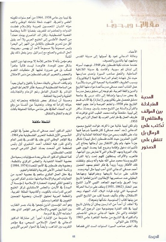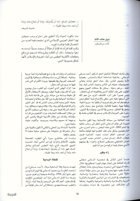 صدر في الأول من شهر يوليو/تموز 2009 العدد رقم (21) من مجلة «الدوحة» الثقافية الشهرية التي تصدرها وزارة الثقافة والفنون والتراث بدولة قطر. ويتضمن العدد مقالة كتبها الأخ نبيل خالد الأغا بعنوان «المفكر أحمد صدقي الدجاني.. حامل المسك». ويشمل سيرة حياته المورقة بوارف العطاءات الفكرية الإسلامية والعروبية. أصدر أكثر من ستين كتاباً. وهو أحد مؤسسي منظمة التحرير الفلسطينية، وأحد الذين أنعم الله عليهم بأعلى مستويات الأخلاق الحميدة. وُلد «أبو الطيب» في يافا عام 1936 وتوفي في القاهرة عام 2003 - رحمه الله.