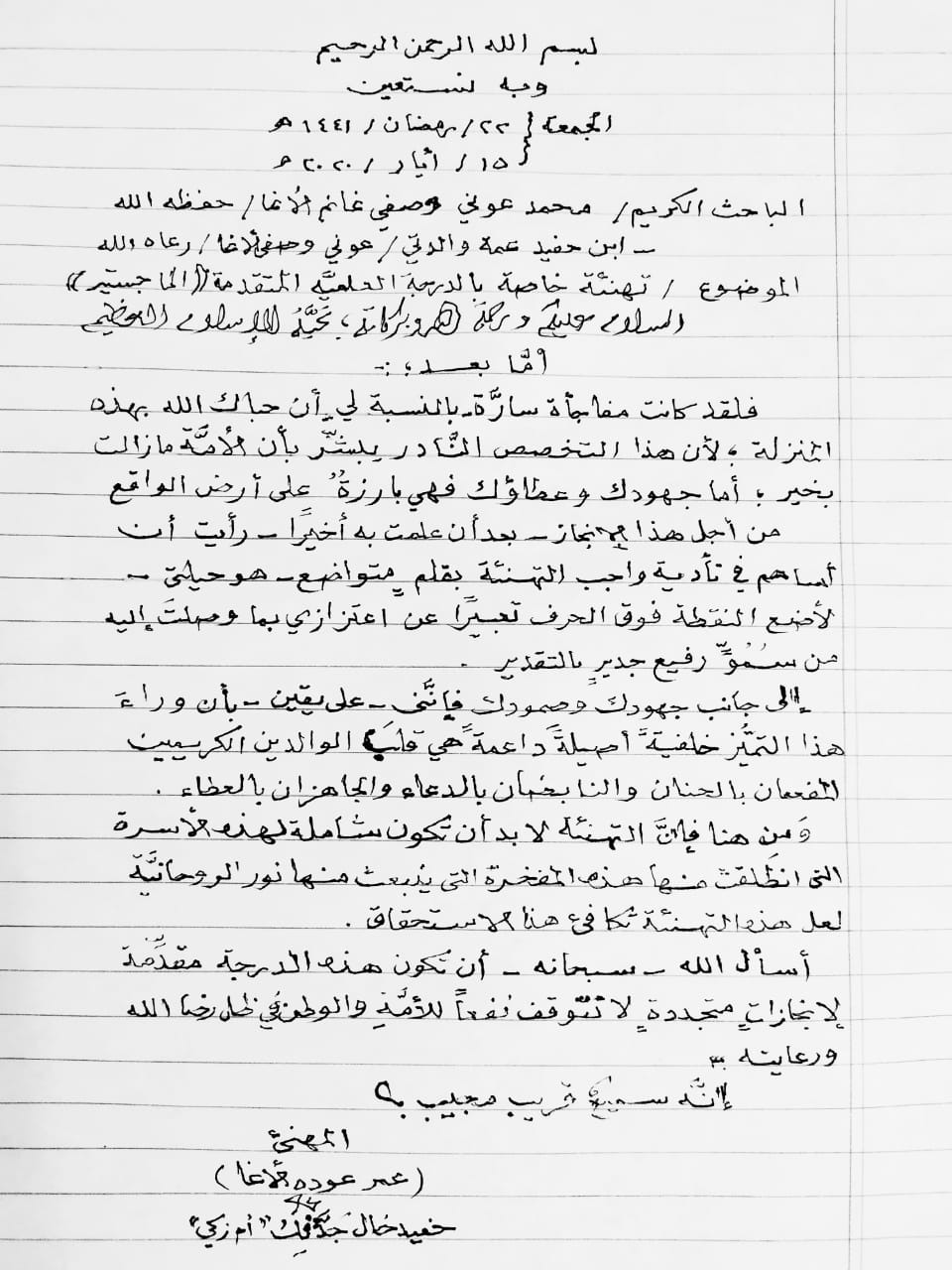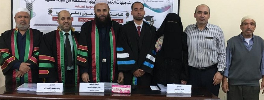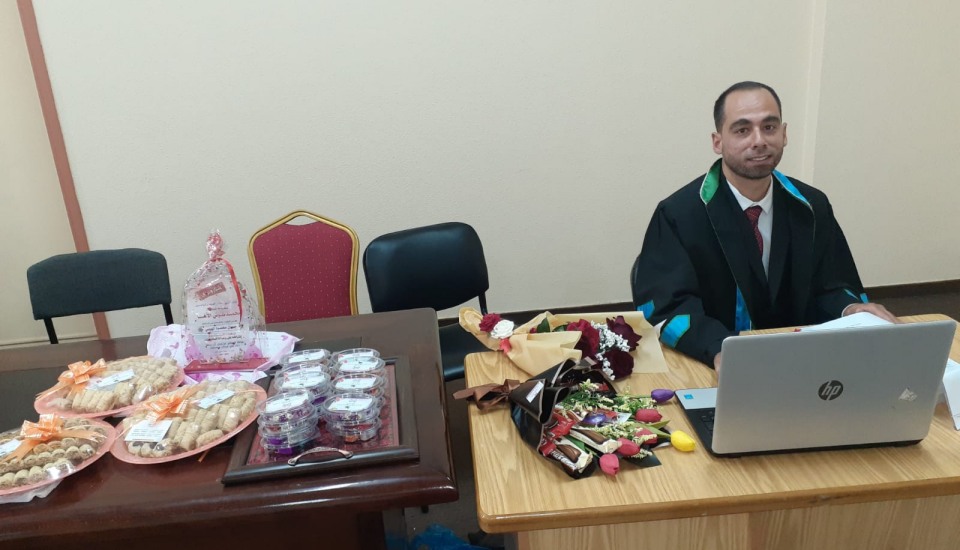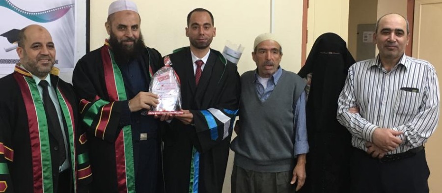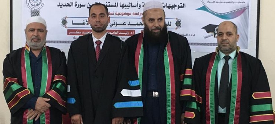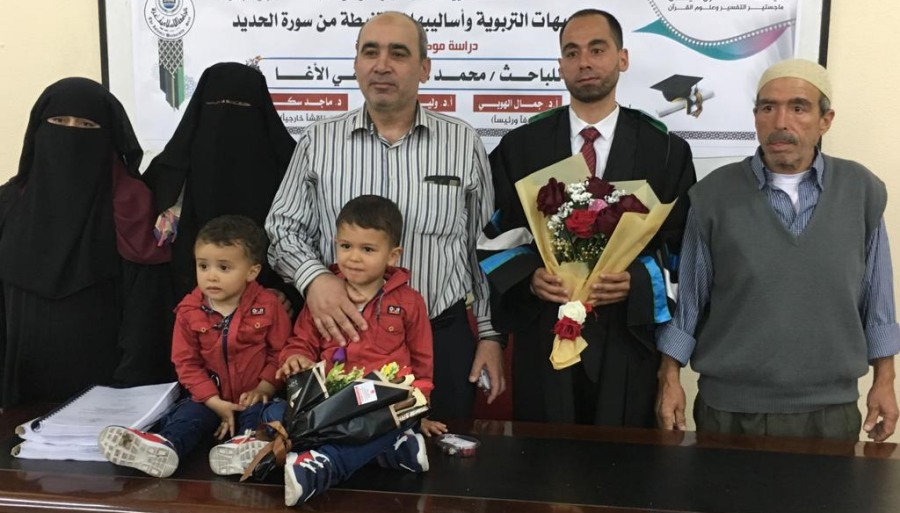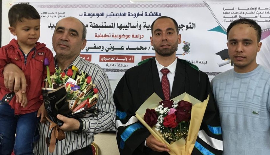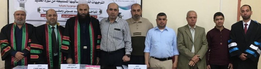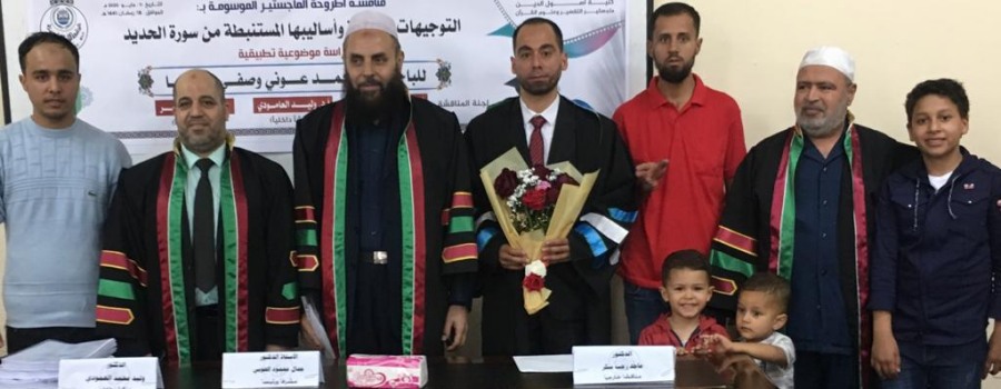 "قل بفضل الله وبرحمته فبذلك فليفرحوا الحمد لله أولا وأخيرا تم منحي درجة الماجستير من الجامعة الإسلامية بغزة في التفسير وعلوم القرآن وكان عنوان الرسالة التوجيهات التربوية وأساليبها المستنبطة من سورة الحديد دراسة موضوعة تطبيقية وفي هذا المقام أتقدم بالشكر والتقدير من الأستاذ الدكتور جمال الهوبي مشرف الرسالة وللمناقشين وكل من حضر ودعم وهنأني لكم مني كل حب ووفاء ..وقد كنت آمل أن أدعوا الجميع ليشاركوني الفرحة ولكن المناقشة بناء على قرار الجامعة نظرا للظروف الراهنة كانت المناقشة داخلية .