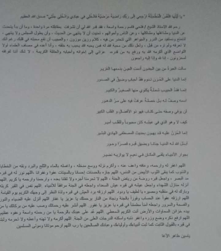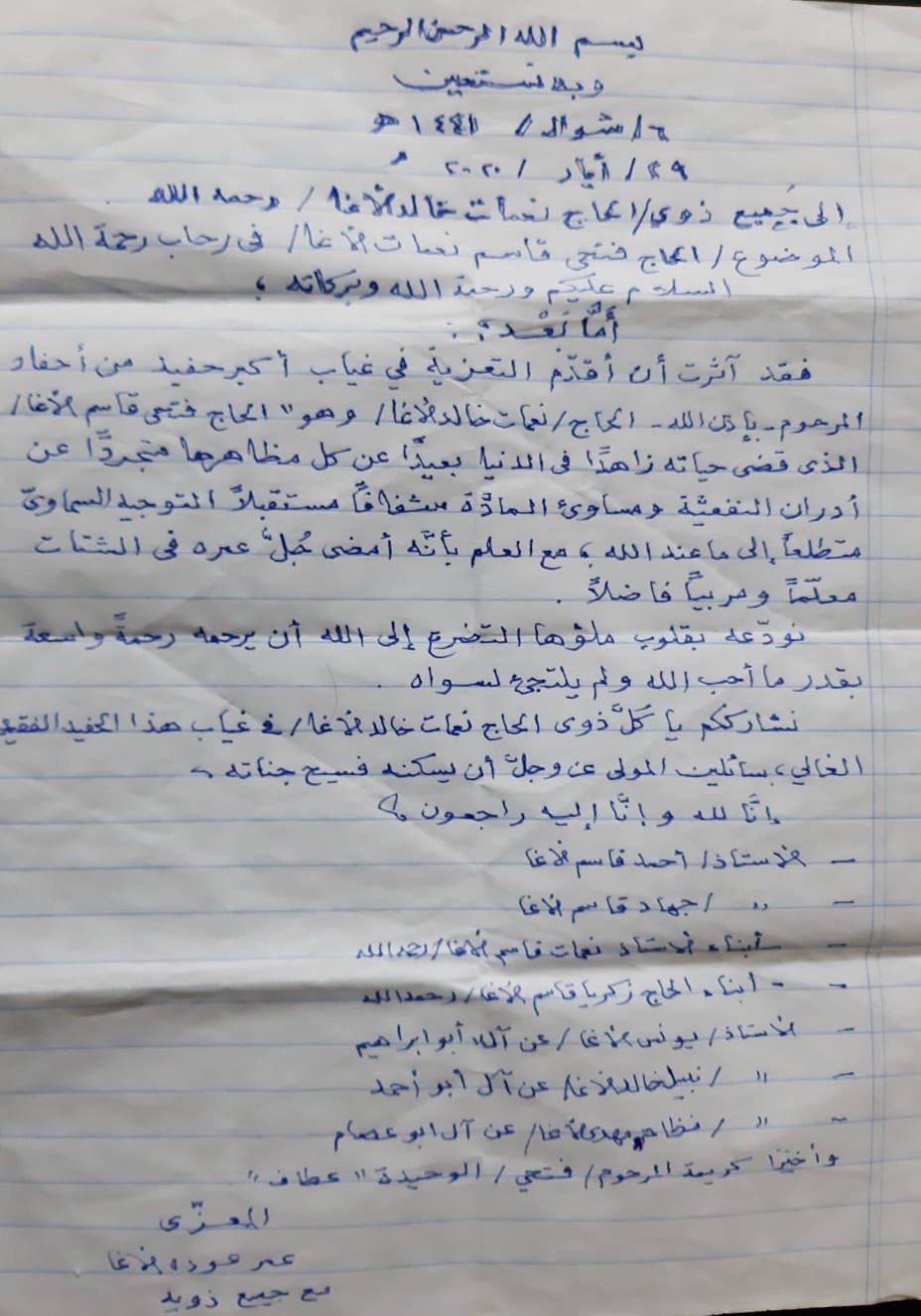 بقلوب ملؤها الإيمان بقضاءِ الله وقدره تنعى عائلة الأغا في الوطن والخارج فقيدها المغفور له بإذن الله تعالى