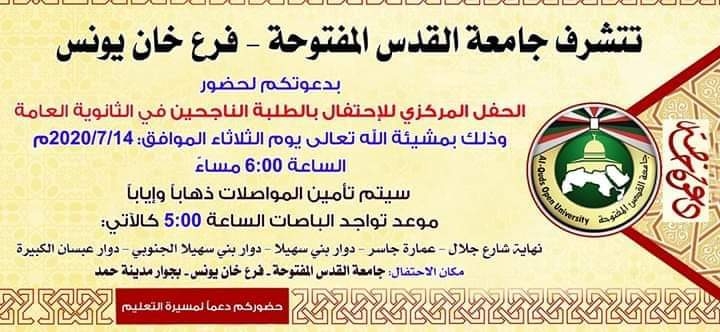 الرئيسة/متفرقات/خاص بخان يونس- دعوة لحضور حفل الطلبة الناجحين في الثانوية العامة في جامعة القدس المفتوحة متفرقات خاص بخان يونس- دعوة لحضور حفل الطلبة الناجحين في الثانوية العامة في جامعة القدس المفتوحة تاريخ النشر : الإثنين | 13-07-2020 | 09:01 3762 اضغط هنا للتواصل أو التعرف على الأستاذ محمد أحمد عودة فالوجي الأغا يمكنك تلقي أحدث الأخبار أول بأول بانضمامك لإحدى مجموعات الواتساب الخاصة بالعائلة من خلال الضغط هنـا اظهر المزيد