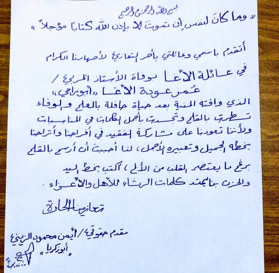 الرئيسة/مقالات/تعزية مقدمة من أيمن محمود الزيني مقالات تعزية مقدمة من أيمن محمود الزيني تاريخ النشر : الجمعة | 17-07-2020 | 12:38 5076 اضغط هنا للتعرف على المرحوم أ. عمر عودة إسعيد محمد سالم إبراهيم(بدوي) الأغا يمكنك تلقي أحدث الأخبار أول بأول بانضمامك لإحدى مجموعات الواتساب الخاصة بالعائلة من خلال الضغط هنـا اظهر المزيد