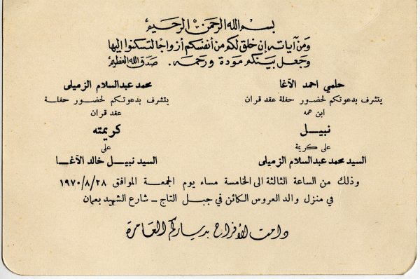 أما في مرحلة الرجولة ففيها حدث المعروف الأكبر الذي غمرني به العم أبو المعتز والعمة أم المعتز معا، وذلك في عمان عام 1970م كيف؟ انتويت في ذلك العام البعيد إكمال نصف ديني بعقد قراني على زوجتي الحالية السيدة وداد محمد عبدالسلام الزميلي فواجهتني مشكلة كتابة بطاقة الدعوة، ذلك ان والدي توفاه الله في خان يونس في عام 1961، ولم يكن الأمر متاحا لإحضار الوالدة الى عمان فاستنجدت بالعم أبي المعتز الذي صادف وجوده مع حرمه في عمان لكتابة الدعوة باسمه، وهو ما تم فعلا «نص الدعوة مرفق بهذا المقال».