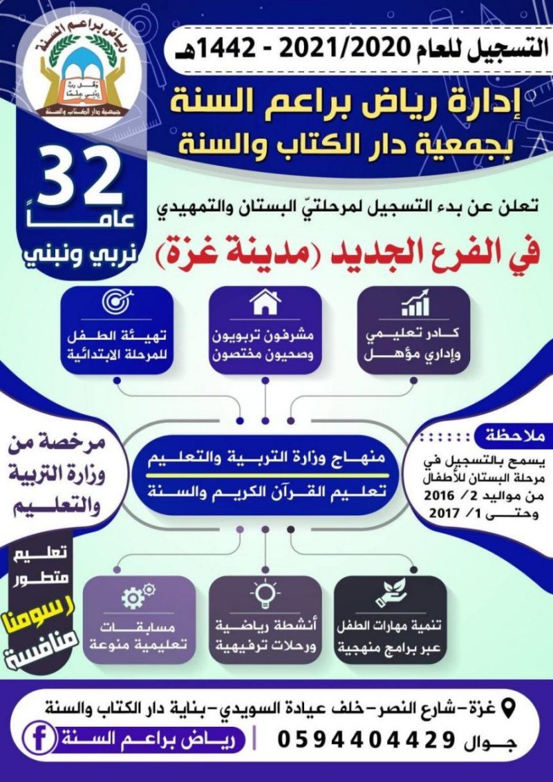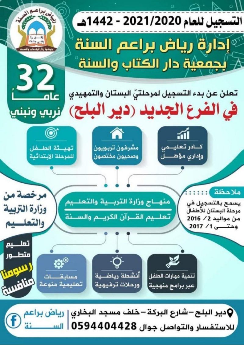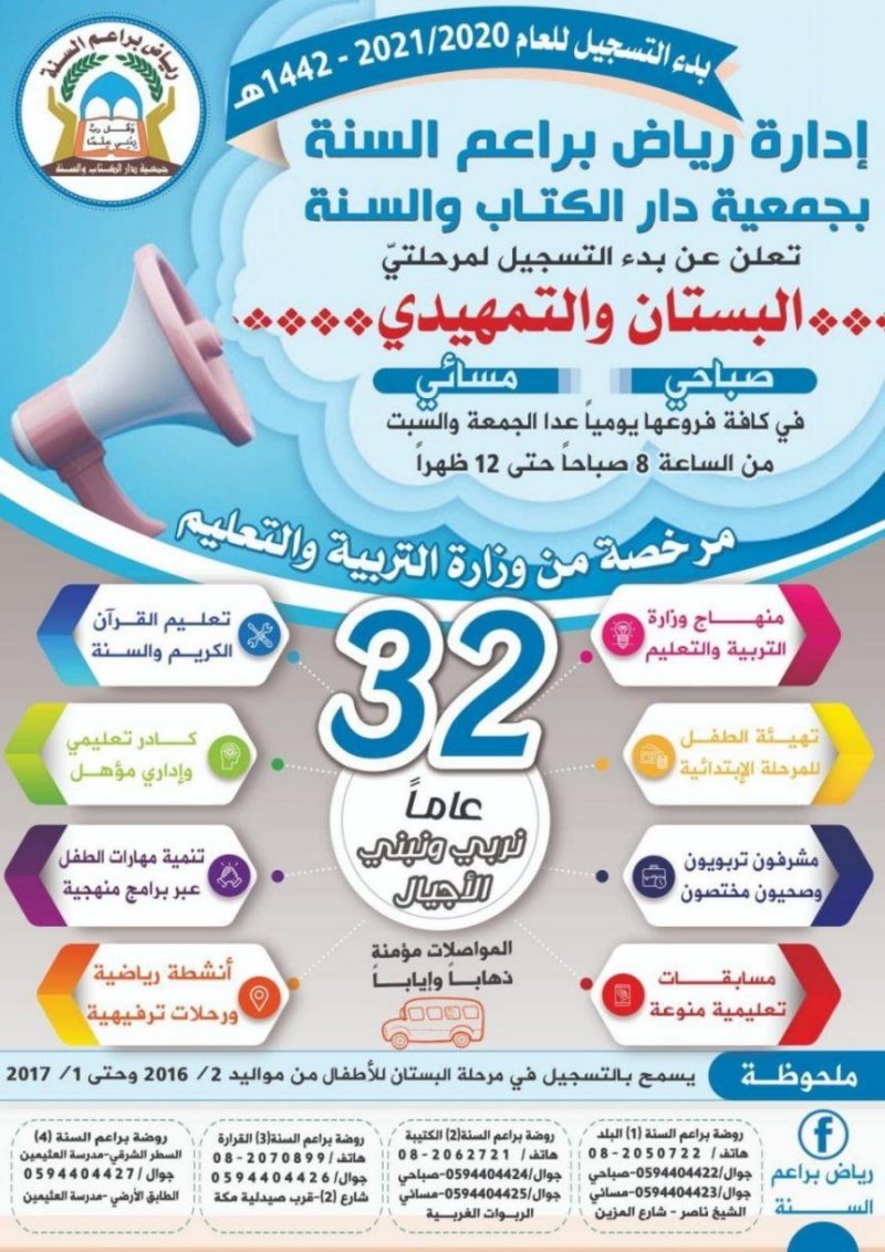 تعلن إدارة رياض براعم السنة - جمعية دار الكتاب والسنة عن التسجيل لمرحلتي البستان والتمهيدي في جميع فروع رياض براعم السنة للعام الدراسي 2020/2021م