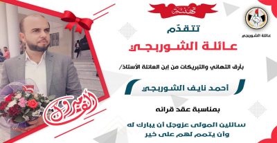 2020-09-29 تم بحمد الله وتوفيقه خطوبة أ. أحمد نايف حمدان إسعيد الشوربجي إلى أ. أسماء عبد الحميد نعيم الجبري بارك الله لكما وبارك عليكما وجمع بينكما فى خير.