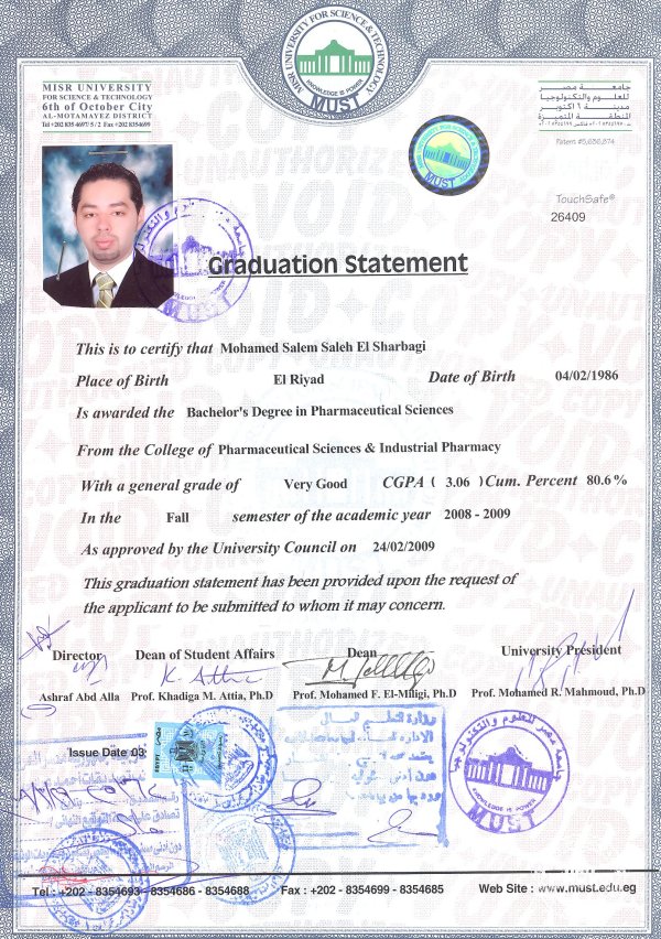 جدة- تخرج د. محمد سالم صالح الشوربجي من كلية الصيدلة من جامعة مصر للعلوم والتكنولوجيا القاهرة، وحصوله على درجة البكالوريوس بتقدير عام جيد جداً مرتفع، وألف مبارك