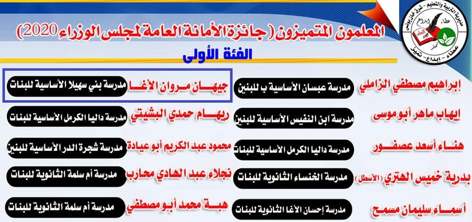 أ. جيهان مروان خليل مصطفى أحمد الأغا تفوز بجائزة الأمانة العامة لمجلس الوزراء فئة المعلمون المتميزون