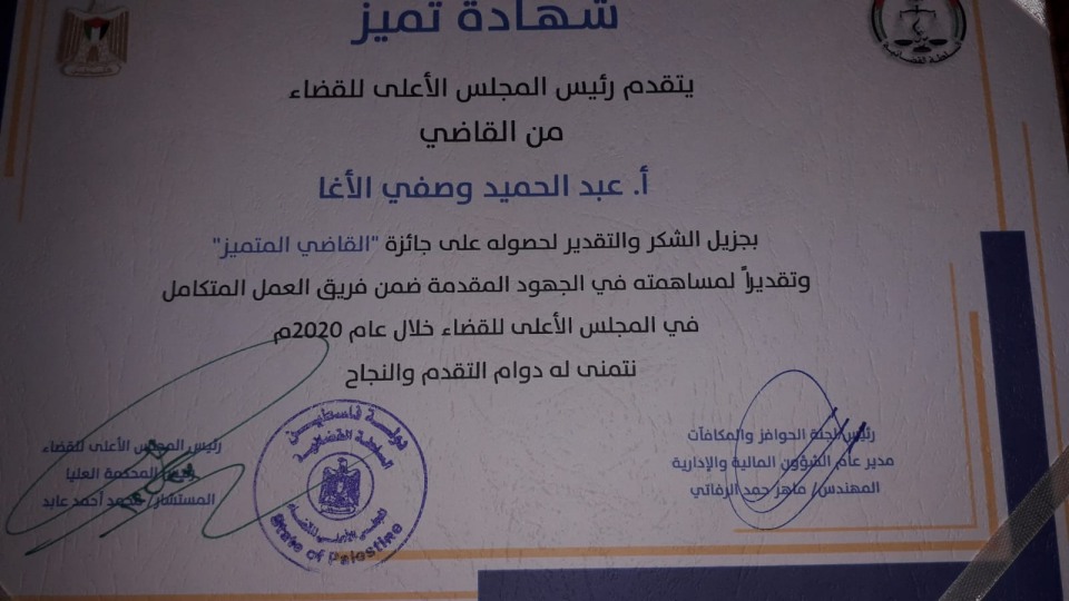كرم رئيس المجلس الأعلى للقضاء المستشار محمد عابد عدد من قضاة محاكم الصلح والبداية والذين تم اختيارهم ضمن جائزة مبادرة تحفيز الكادر القضائي للعام 2019، بحضور المستشار زياد ثابت رئيس المكتب الفني والتفتيش القضائي والمهندس ماهر الرفاتي مدير عام المحاكم النظامية، وقد تم ترقية وتكريم المستشار عبدالحميد وصفى الاغا الى قاضي محكمة بداية، وألف مبارك.
