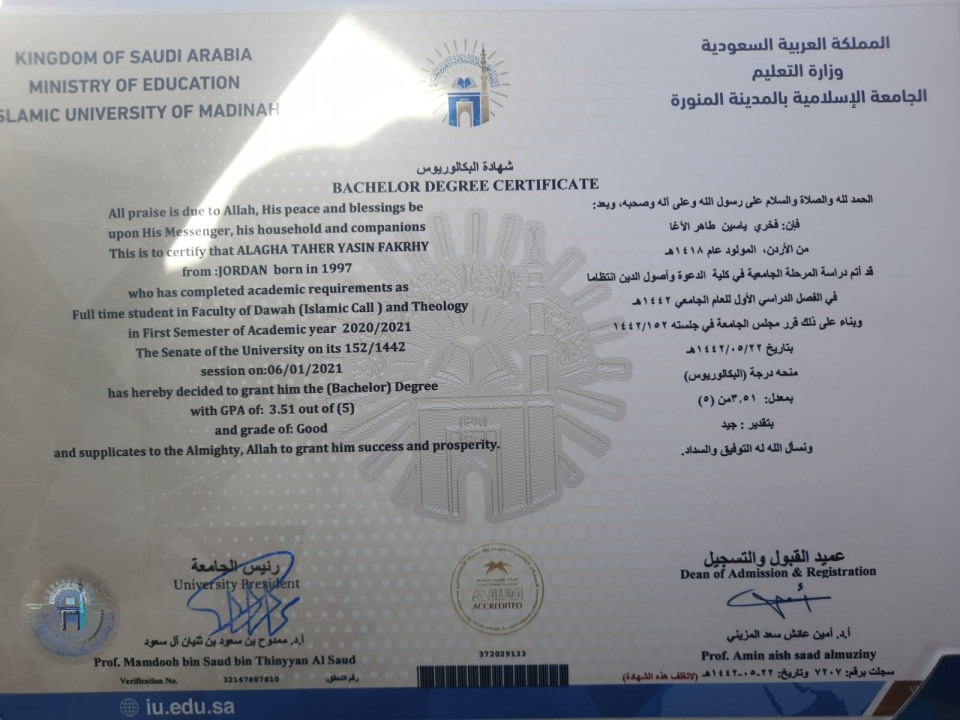 أكرمني الله بتخرجي من الجامعة الإسلامية بالمدينة المنورة وقد أتممت بها عمرا من العلم والعمل .