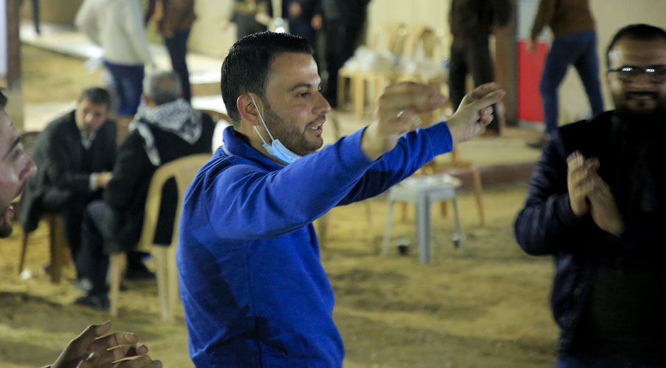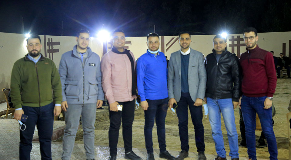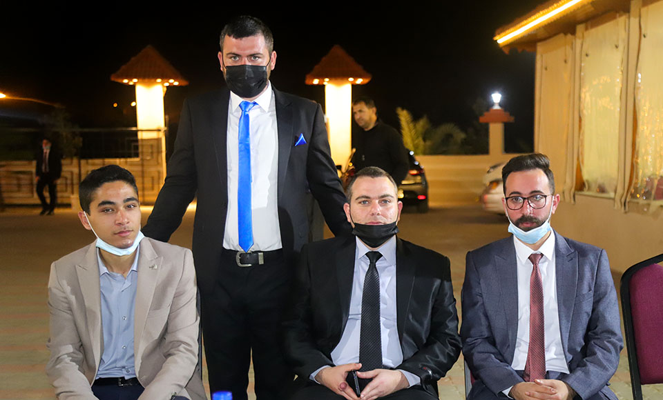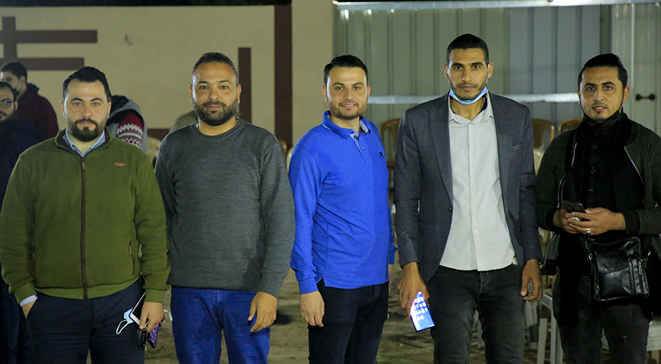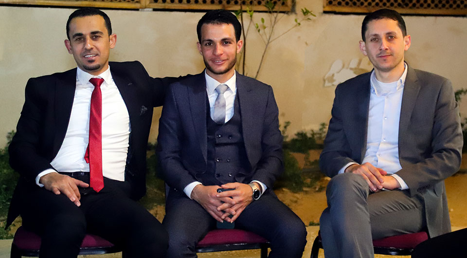 الصحفي هاني الشاعر، الصحفي حسن إصليح، العريس، الصحفي أشرف أبو عمرة، الصحفي رمضان عبد المعطي (شقيق العريس)