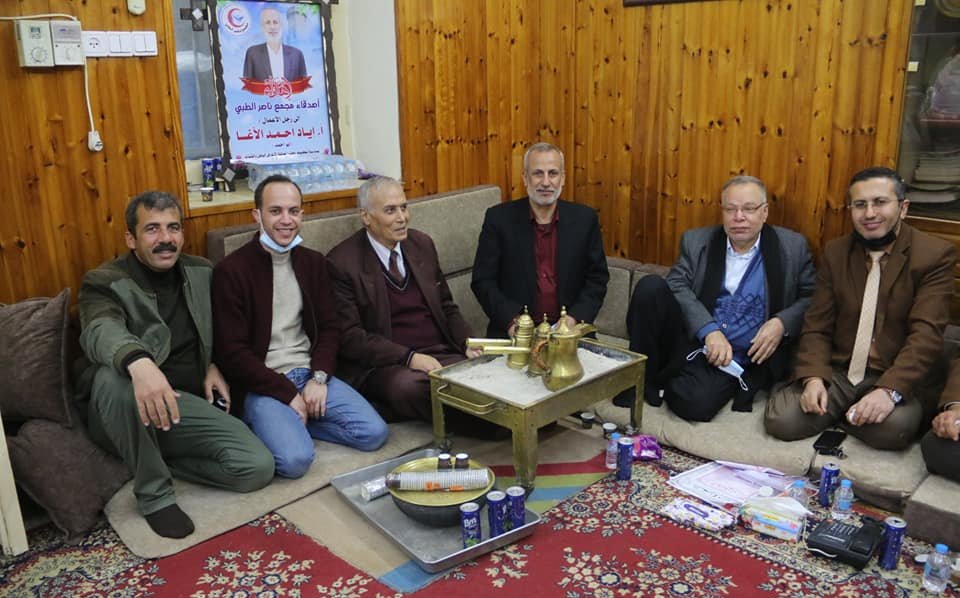 توجه وفد من لجنة أصدقاء مجمع ناصر الطبي وبمشاركة كريمة من إدارة مجمع ناصر الطبي ومشفى غزة الأوروبي لزيارة ديوان عائلة الأغا الكرام ؛ لتهنئة رجل الأعمال و عضو لجنة أصدقاء مجمع ناصر الطبي الأستاذ الفاضل : إياد أحمد الأغا أبا أحمد بتوليه منصب المختار لعائلة الأغا.