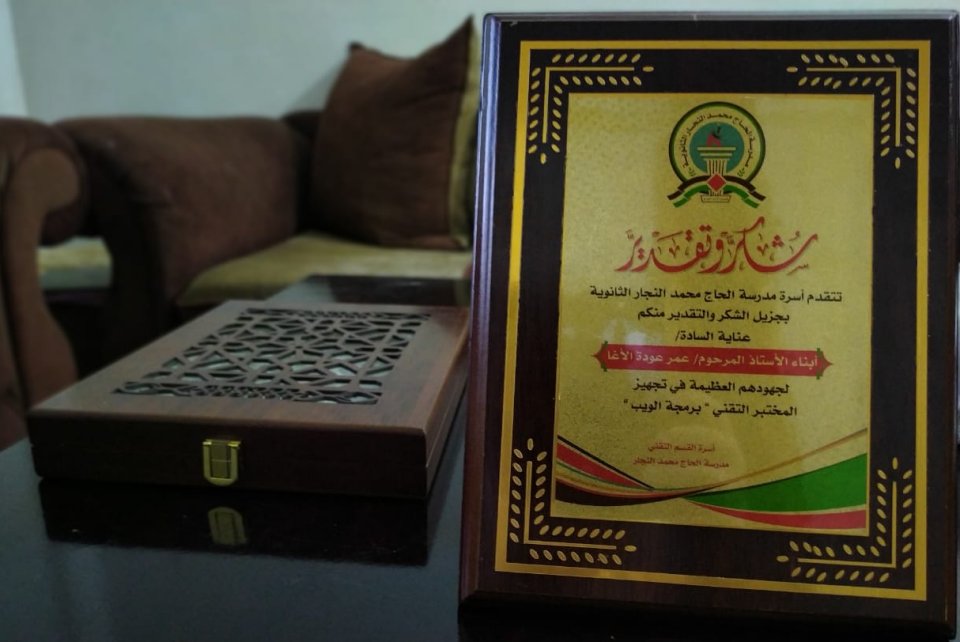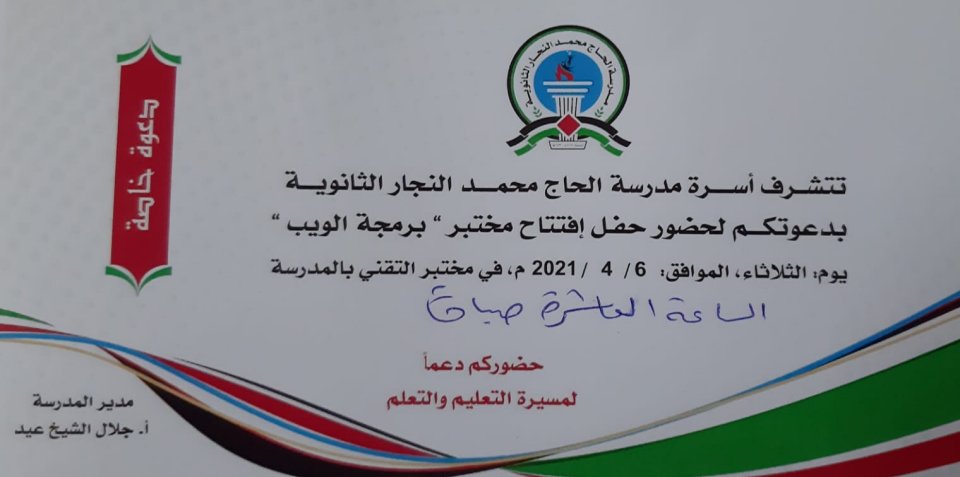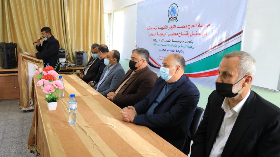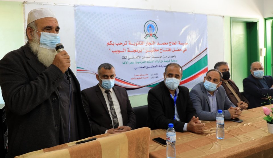 تم بحمد الله وتوفيقه إفتتاح مختبر برمجة الويب بتمويل من مؤسسة التعاون الألماني GIZ ورعاية كريمة من أبناء الأستاذ المرحوم عمر عودة الأغا ومشاركة المجتمع المحلي وذالك في مدرسة الحاج محمد النجار الثانوية، الكائنة في مدينة خان يونس بجوار دوار بني سهيلا.