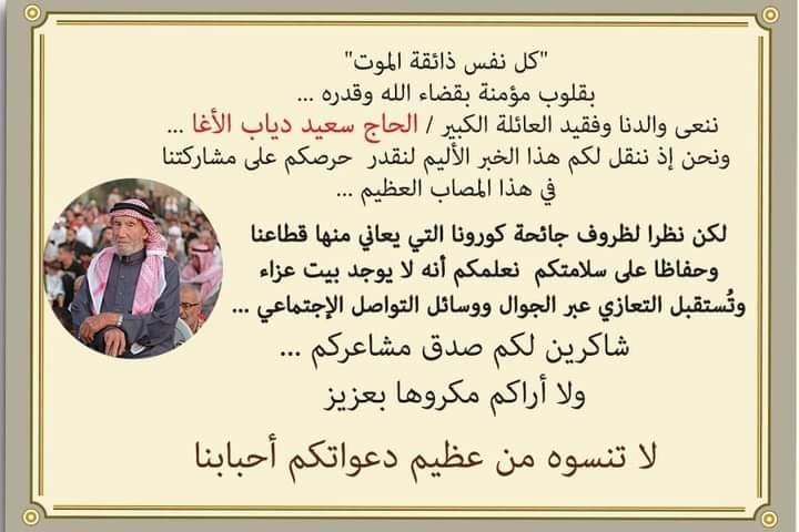 بقلوب ملؤها الإيمان بقضاءِ الله وقدره تنعى عائلة الأغا في الوطن والخارج فقيدها المغفور له بإذن الله تعالى