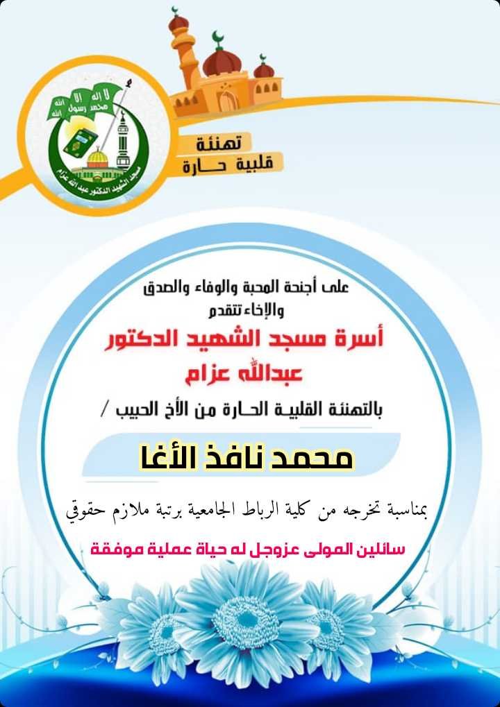 2021-04-28 تم بحمد الله وتوفيقه منح أ. محمد نافذ كامل شاكر الأغا درجة البكالوريوس تخصص علوم أمنية أوعسكرية من جامعة كلية الرباط الجامعية مع أجمل التهاني والأمنيات بالمزيد من التوفيق والسداد والنجاح، سائلين الله عز وجل أن ينتفع به العباد والبلاد.