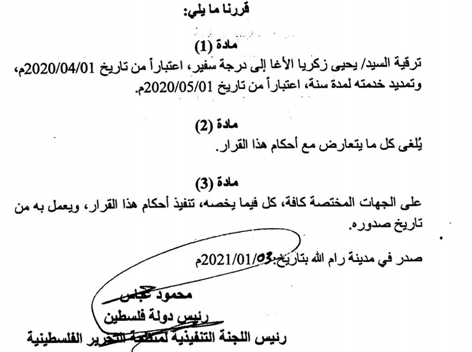 ترقية د. يحيى زكريا الأغا إلى درجة سفير بناءا على قرار فخامة الرئيس محمود عباس رئيس دولة فلسطين ورئيس اللجنة التنفيذية لمنظة التحرير الفلسطينية، وألف مبارك.
