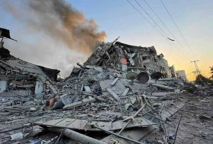 The targeted "Al Shorouk" tower includes apartments, and a number of corporate offices and press institutions operating in Gaza. Pictures of the devastation caused by the bombing of the Al-Shorouk Tower in Gaza are shown here.